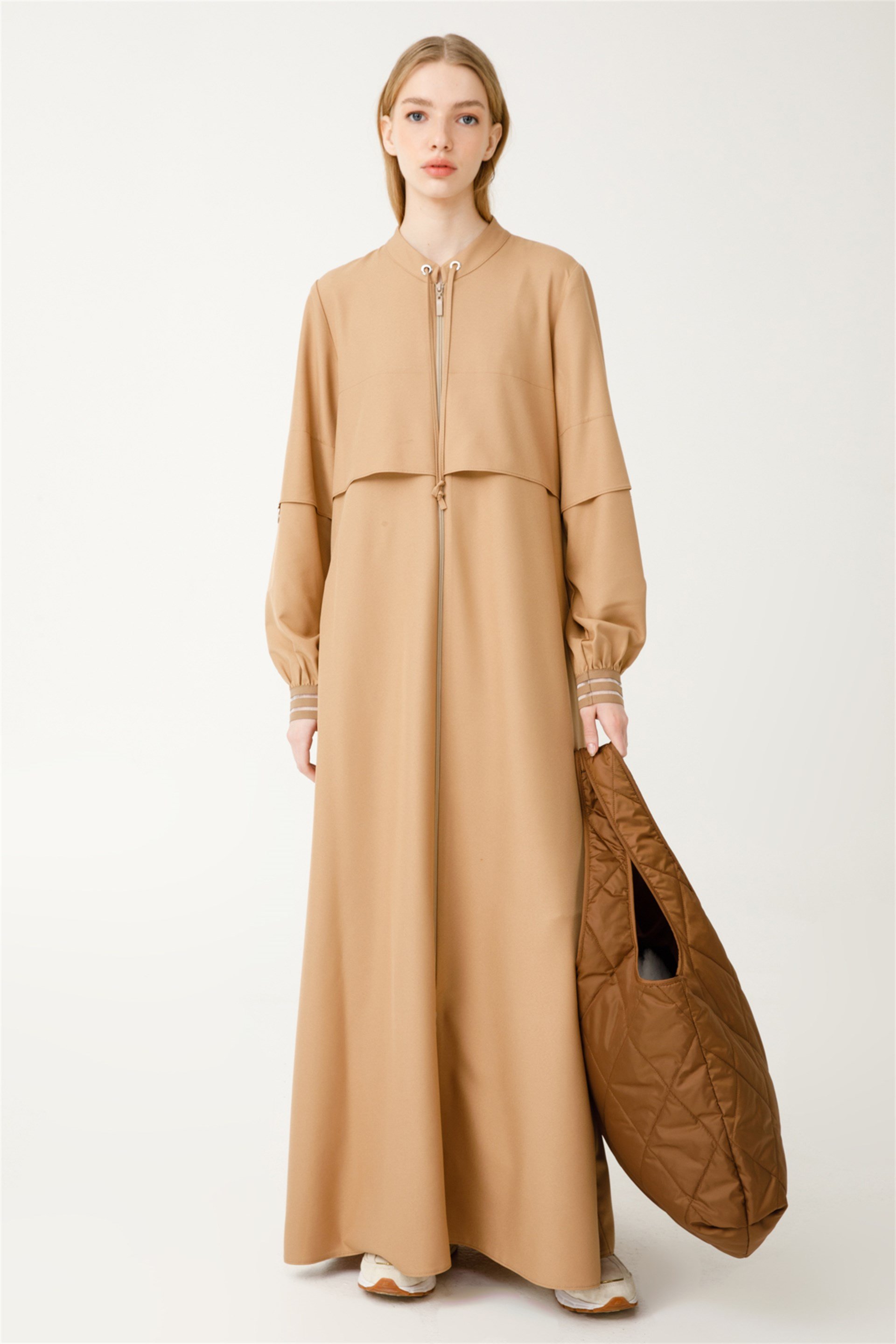 Aller Parçalı Kolları Ribanalı Hafif ve Zor Kırışan Kumaştan Tam Boy Spor Kap-Camel (221539M PARDESÜ-08)