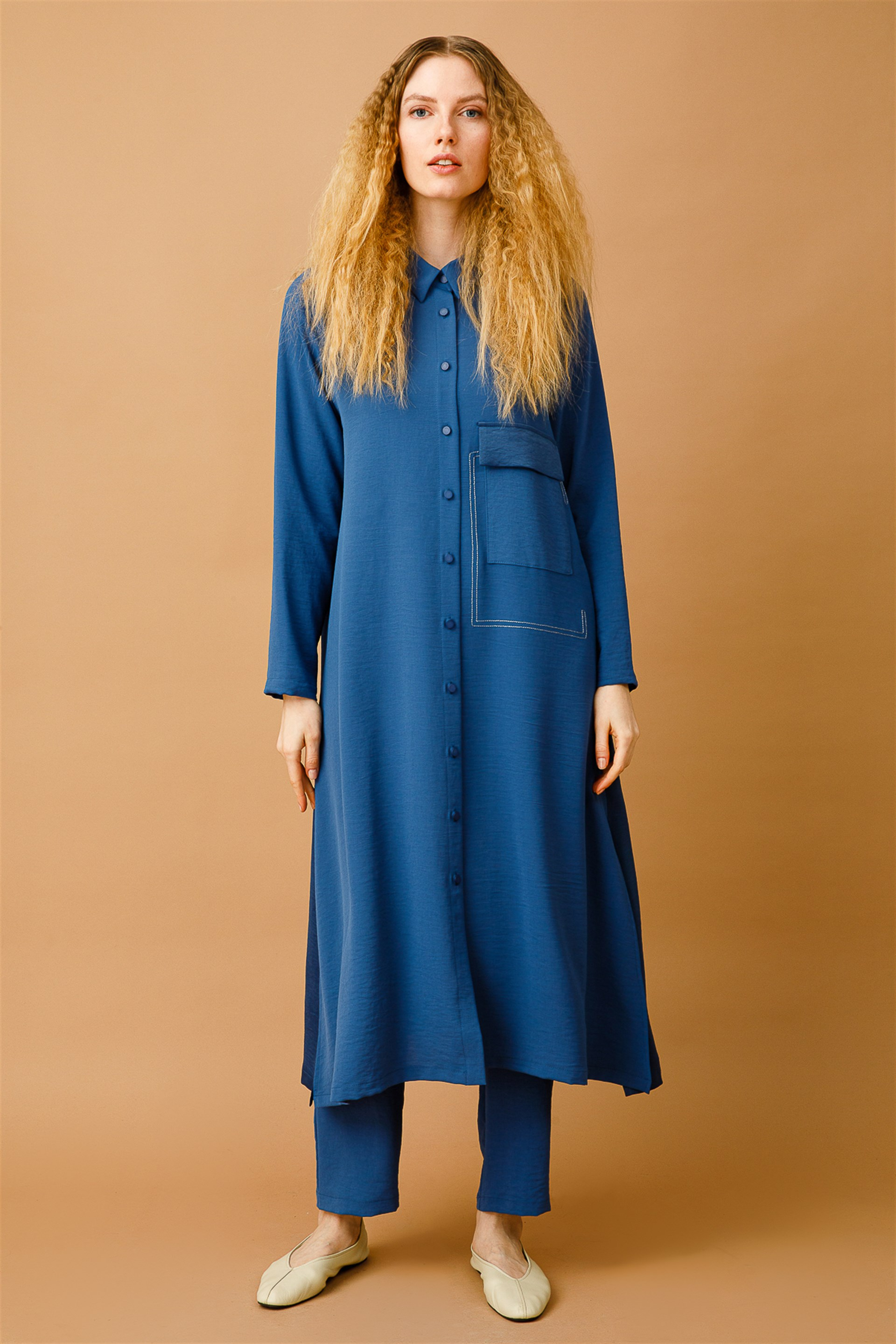 Arkası ve Cep Kapağı Saten Garni Detaylı Nefes Alan Zor Kırışan Spor Kap Tunik-İndigo (221413M TUNİK-44)
