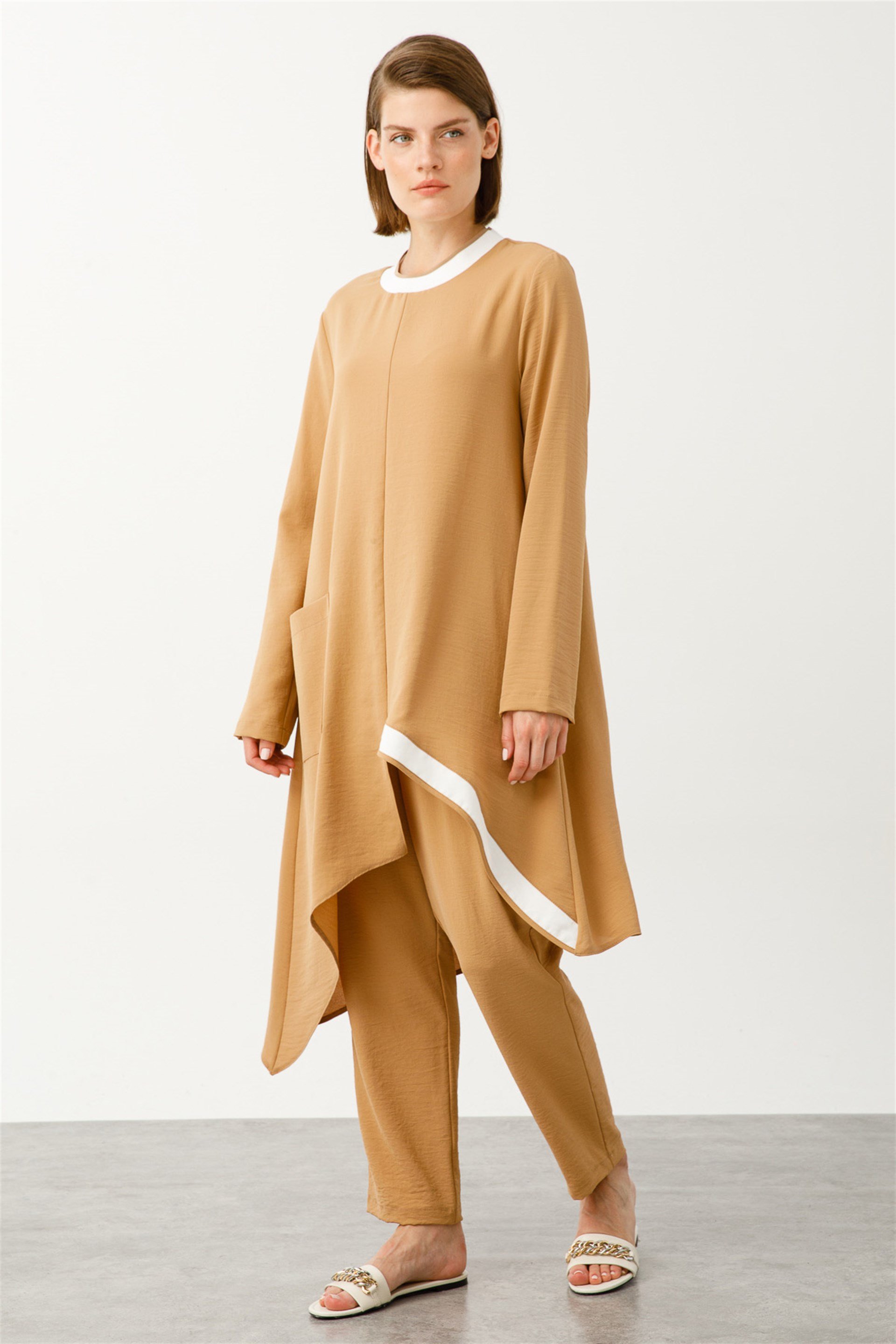 Asimetrik ve Kontrast Tasarım Spor Tunik Kap-Camel (221417M TUNİK-08)