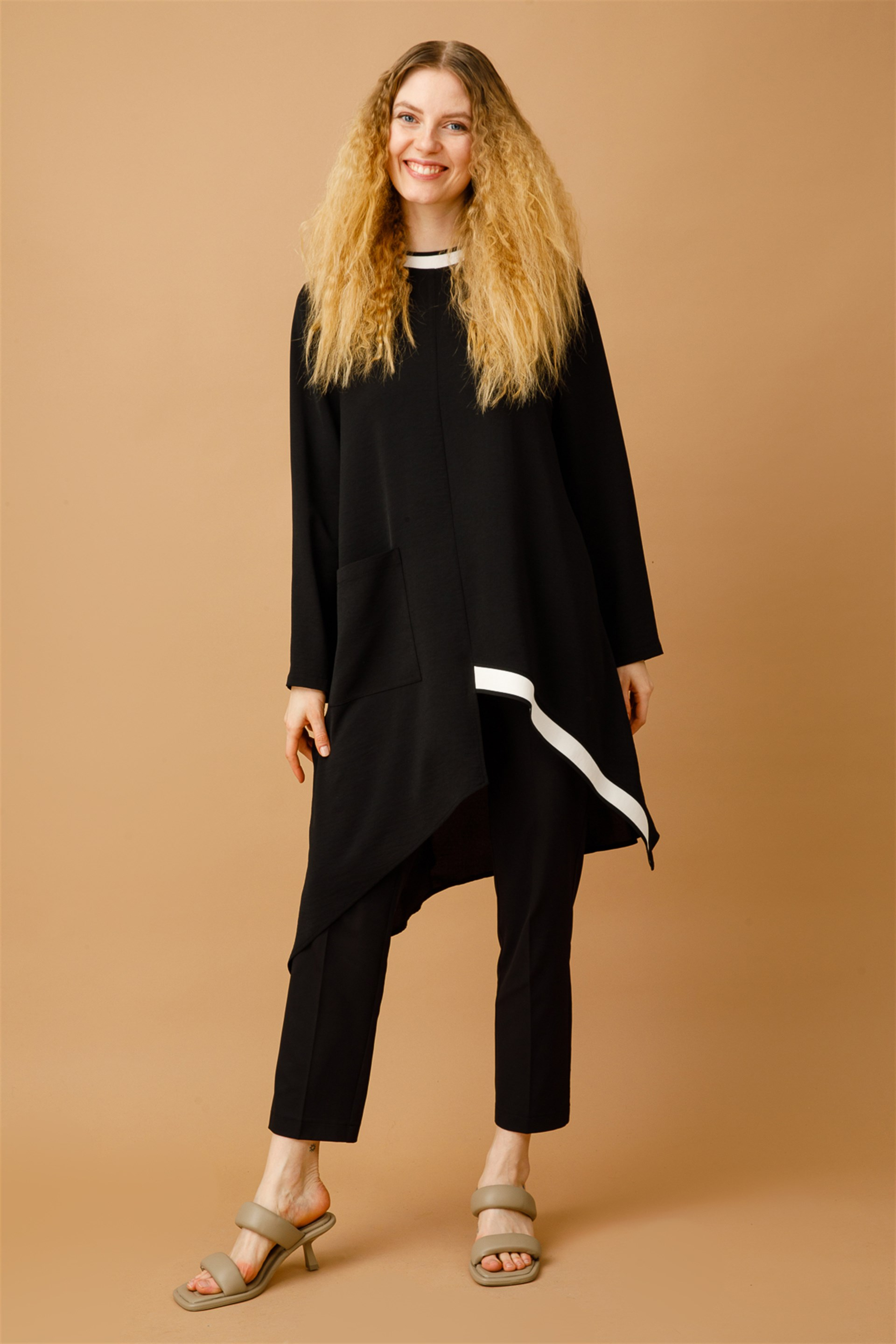 Asimetrik ve Kontrast Tasarım Spor Tunik Kap-Siyah (221417M TUNİK-01)
