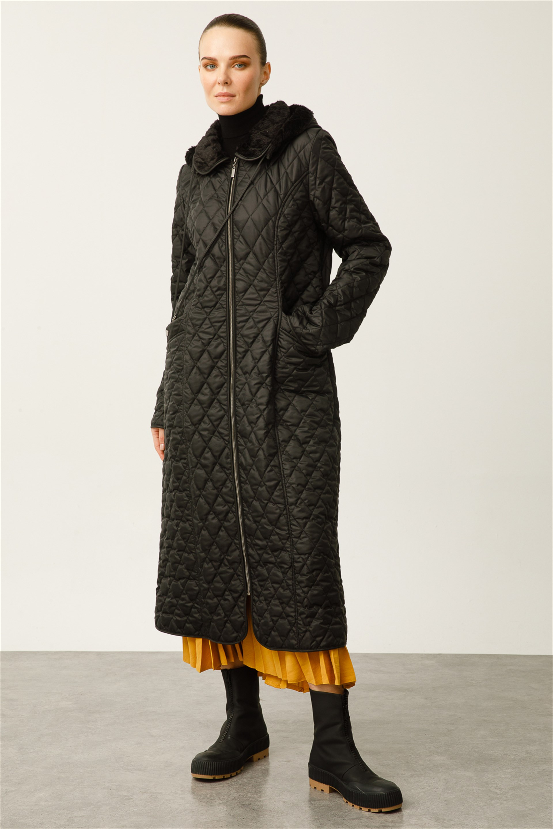 Astarı Peluş ve Kapitone Dolgulu Hafif Zamansız Manto-Siyah