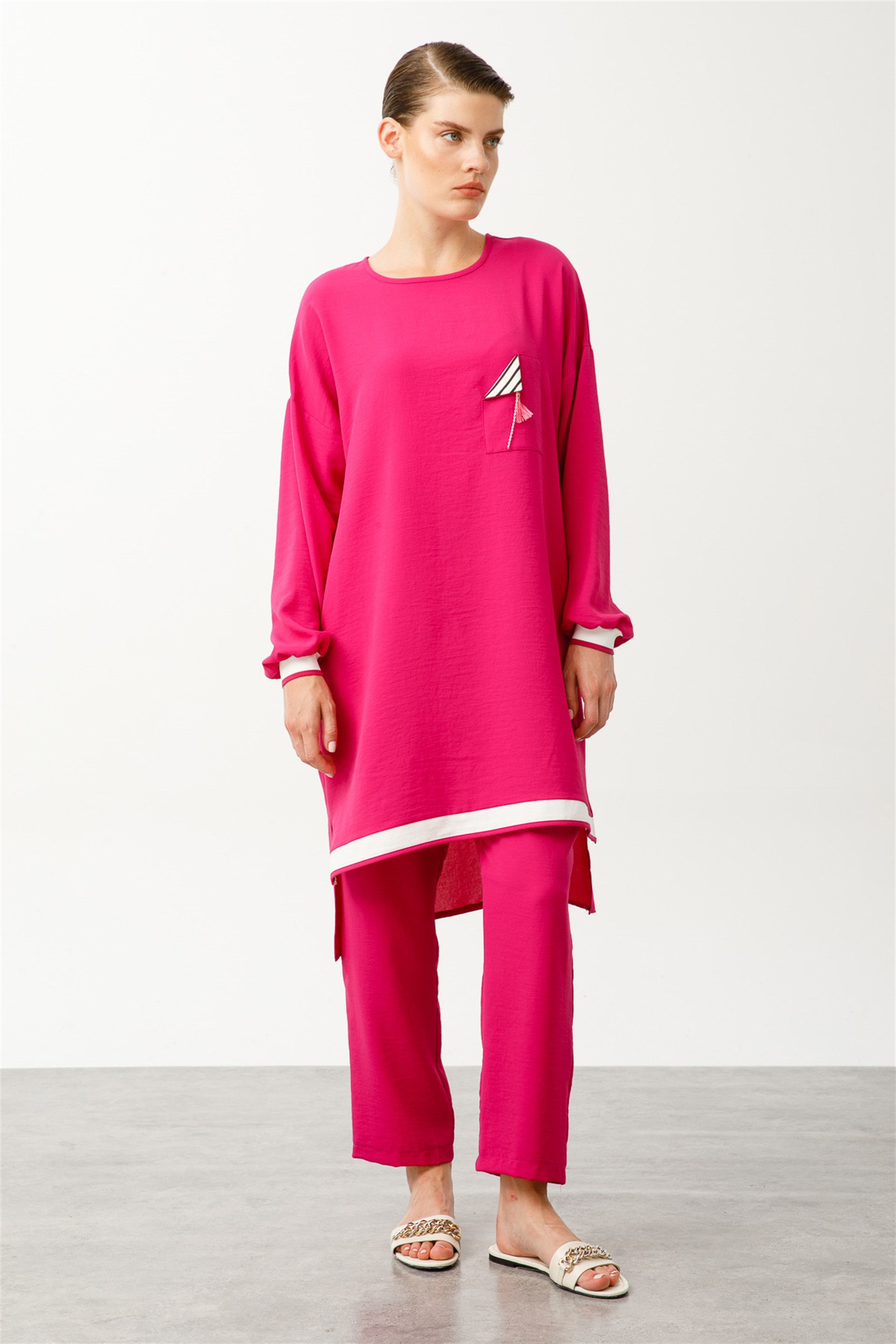 Beyaz Detaylarla Süslenmiş Farklı Cepli Tunik Kap-Fuşya