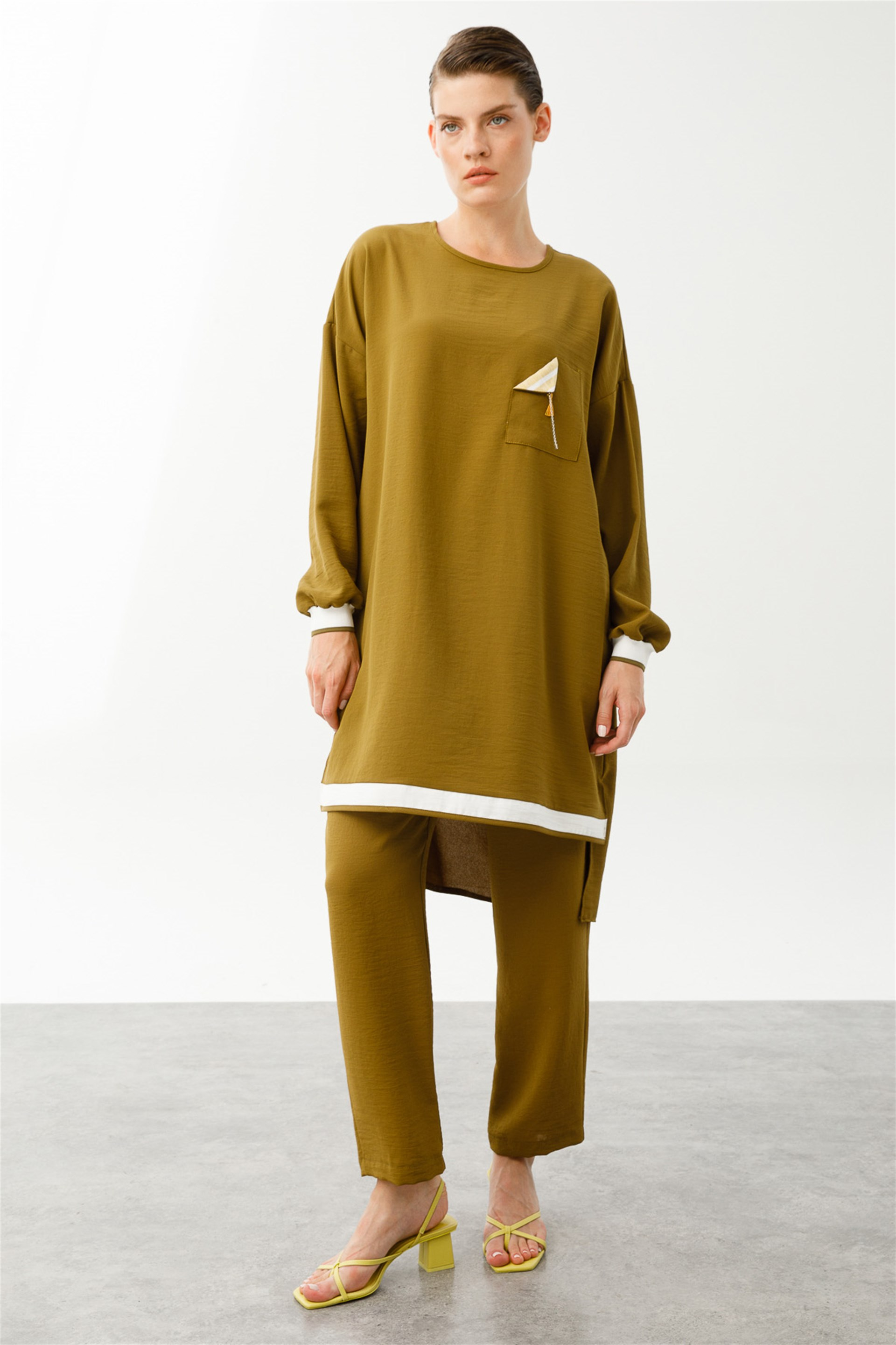 Beyaz Detaylarla Süslenmiş Farklı Cepli Tunik Kap-Haki (221414M TUNİK-20)
