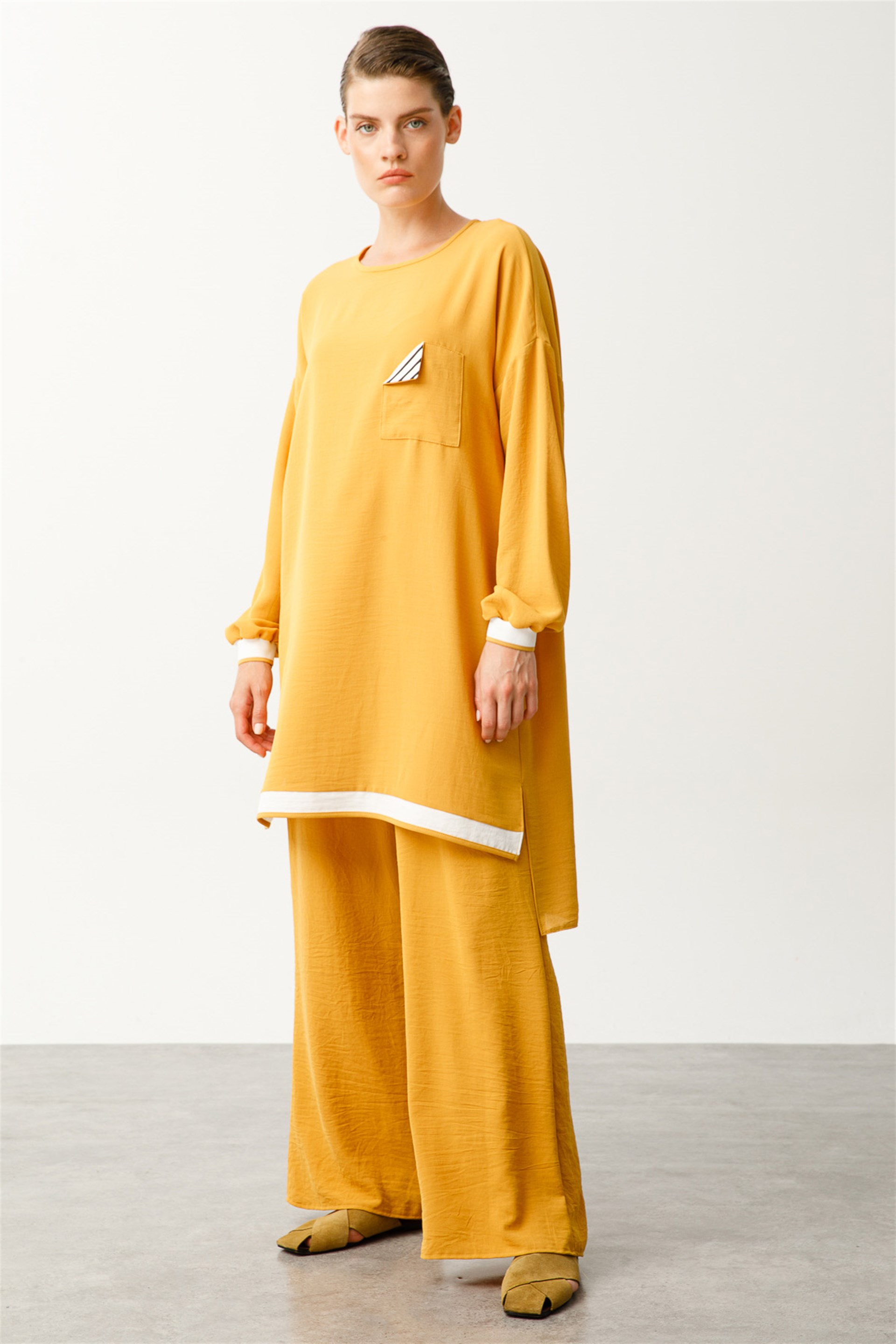 Beyaz Detaylarla Süslenmiş Farklı Cepli Tunik Kap-Hardal (221414M TUNİK-84)