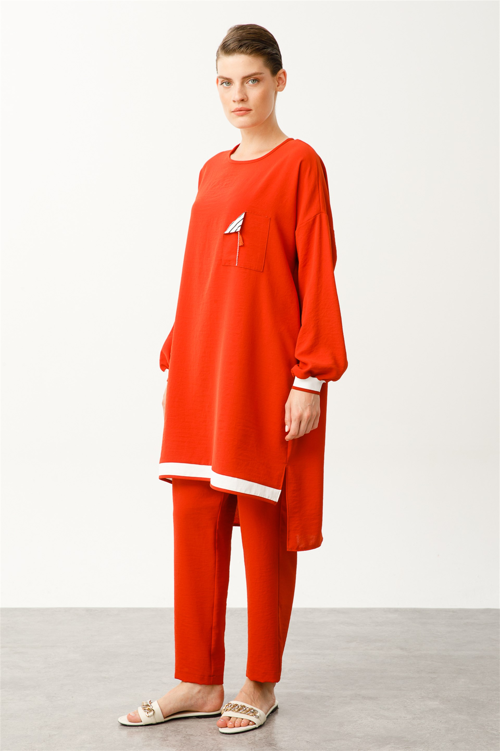 Beyaz Detaylarla Süslenmiş Farklı Cepli Tunik Kap-KİREMİT (221414M TUNİK-39)