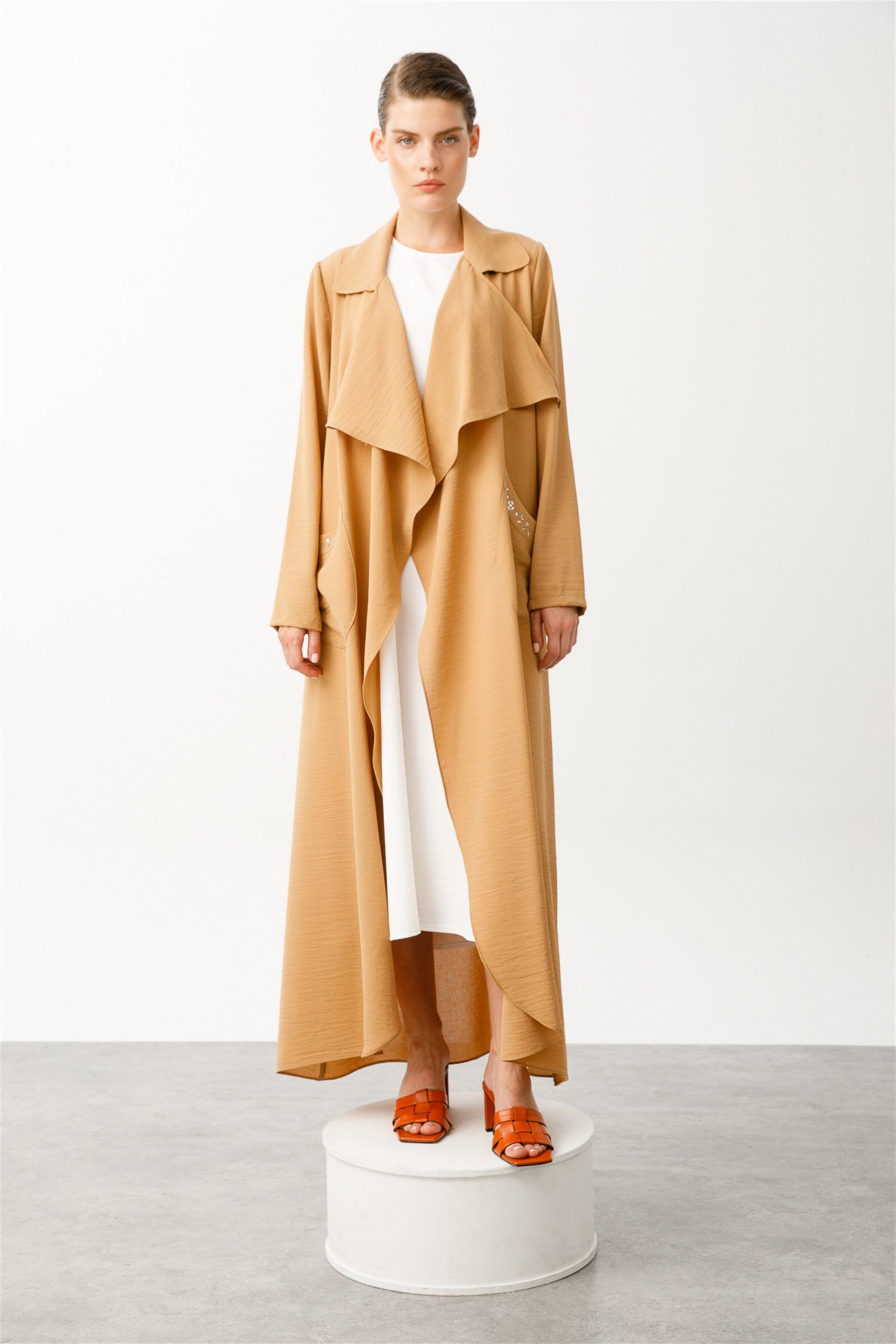 Cep Kenarı Taş İşleme Volanlı Rahat Çok Amaçlı Kap Ferace-Camel (221552M PARDESÜ-08)