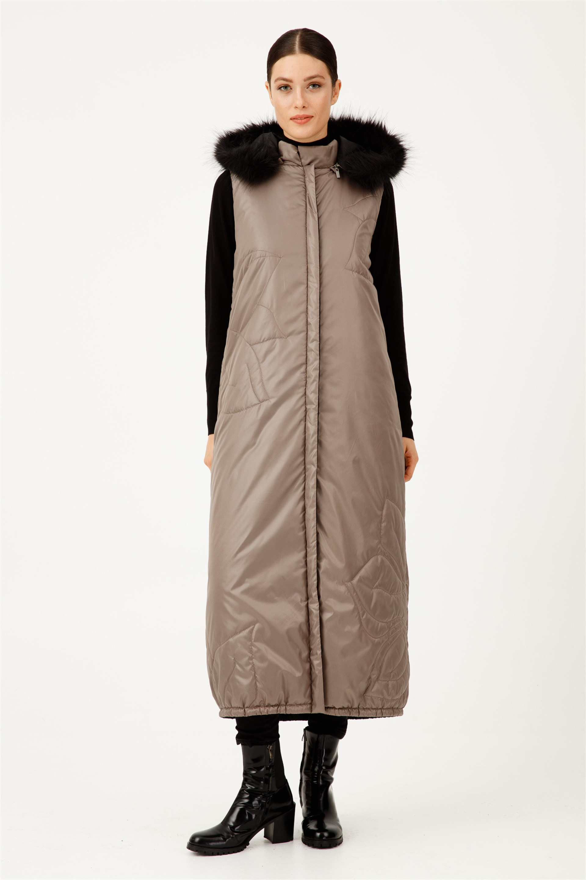 Çiçek Nakışlı Çift Taraflı Şişme Yelek-Vizon (202702M YELEK-16)