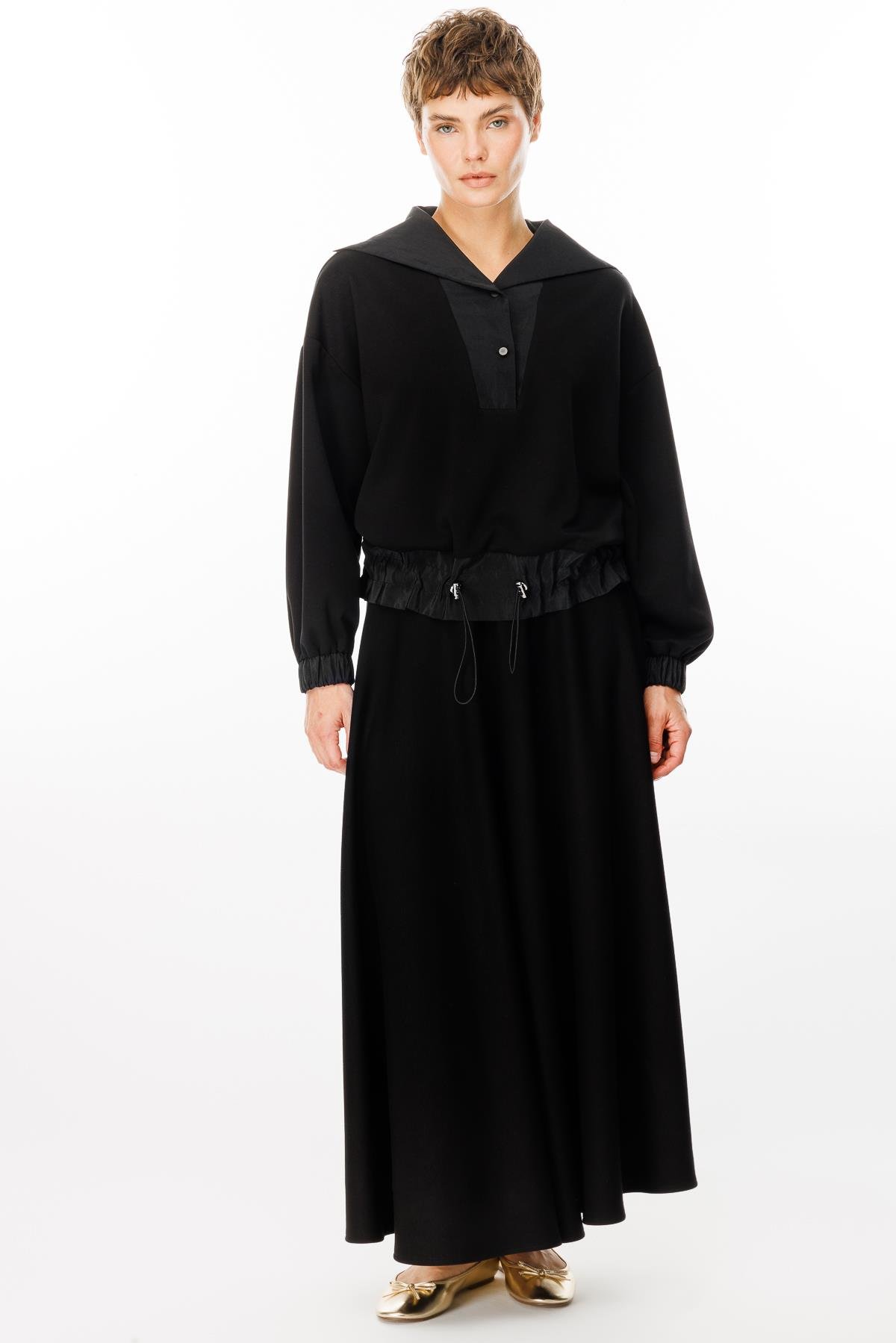 Cielo Etek ve Kapüşonlu Tunik Kombinli Spor Örme Takım-Siyah (242837M ETEKLİ KOMBİN-01)