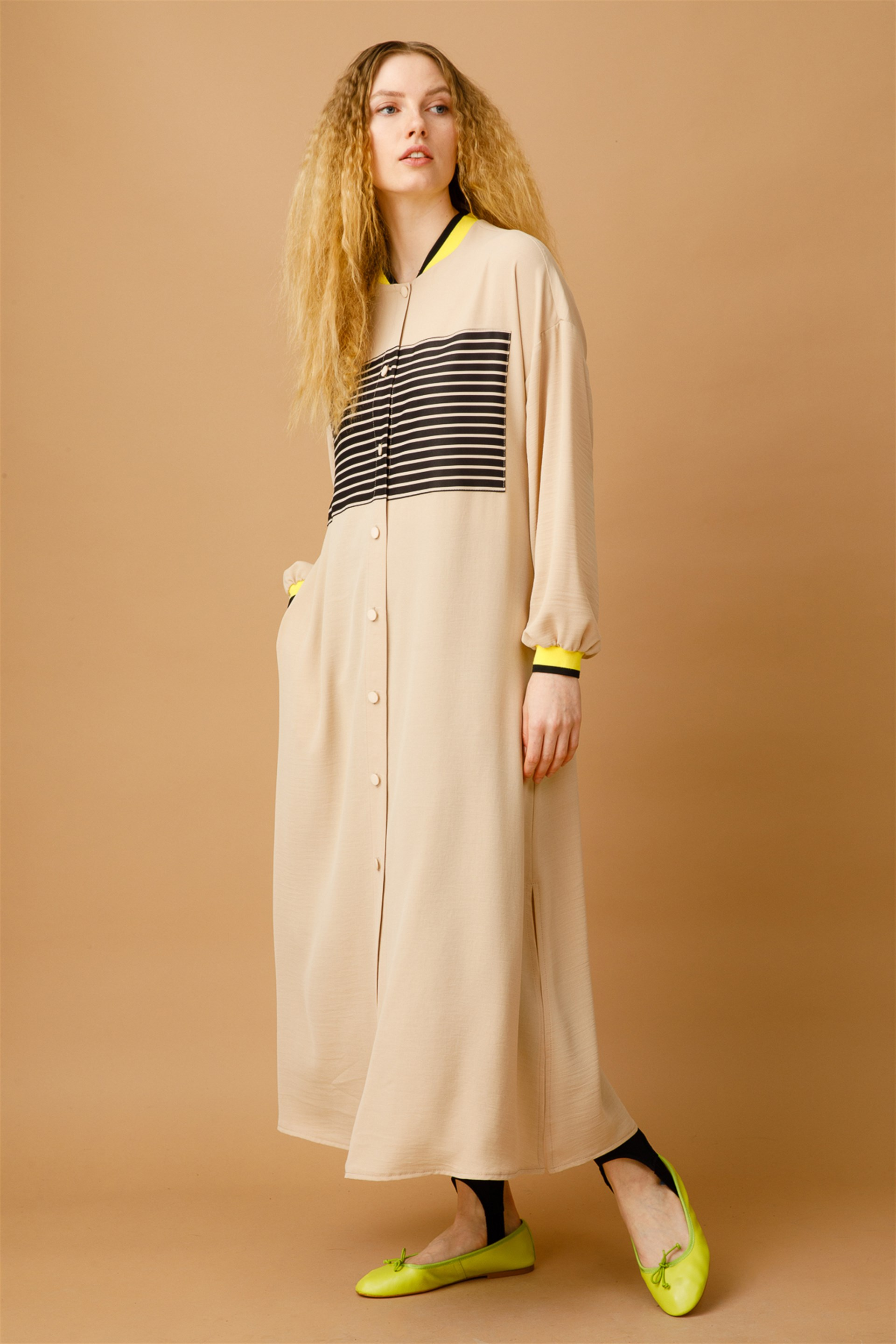 Çizgi Garnili Düğmeli Hafif Nefes Alan ve Zor Kırışan Kumaştan Spor Kap Üretim Ülkesi: Türkiye Sezon: 2022 İlkbahar Yaz Kumaş İçeriği: %100 Polyester Boy Uzunluğu: 132 cm Ürün Ölçüleri 38/40 Beden için: Göğüs 114 cm, Basen 121 cm Bedenler arası 6 cm fark etmektedir. Manken Ölçüleri Giydiği Beden: 36 Boy: 175 cm Göğüs: 75 cm , Bel: 60 cm , Basen: 88 cm
