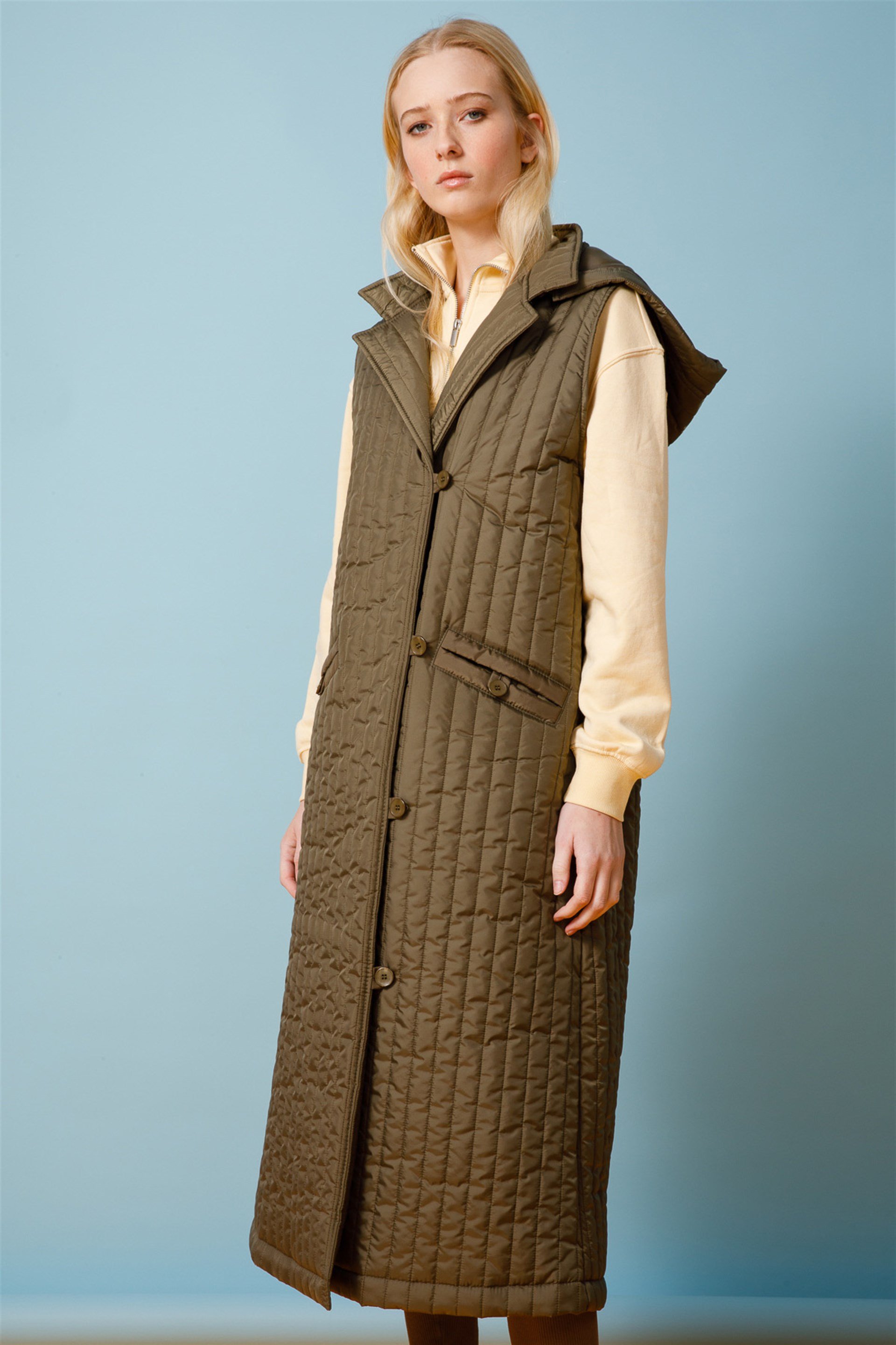 Çizgi Kapitoneli Yandan Düğmeli Spor ve Gündelik Hayat İçin Uzun Kapitone Yelek-Haki (221721M YELEK-20)