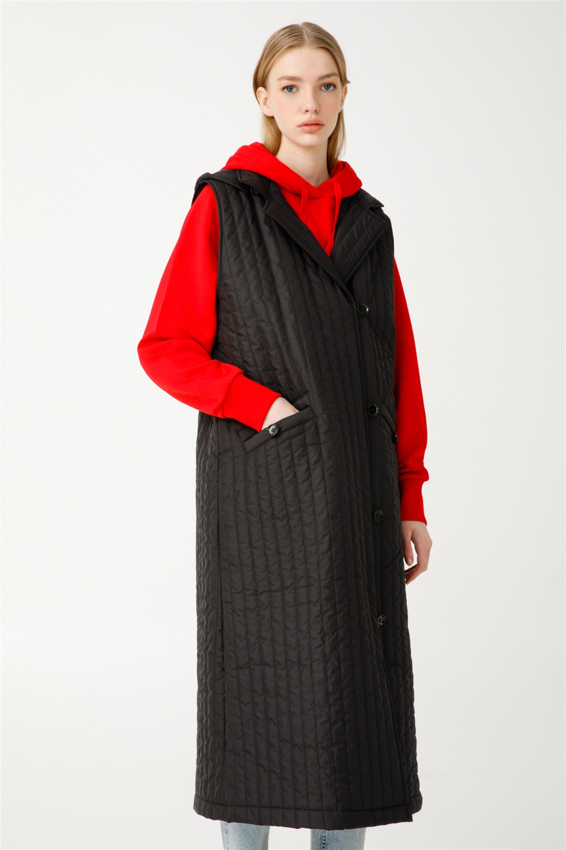 Çizgi Kapitoneli Yandan Düğmeli Spor ve Gündelik Hayat İçin Uzun Kapitone Yelek-Siyah (221721M YELEK-01)
