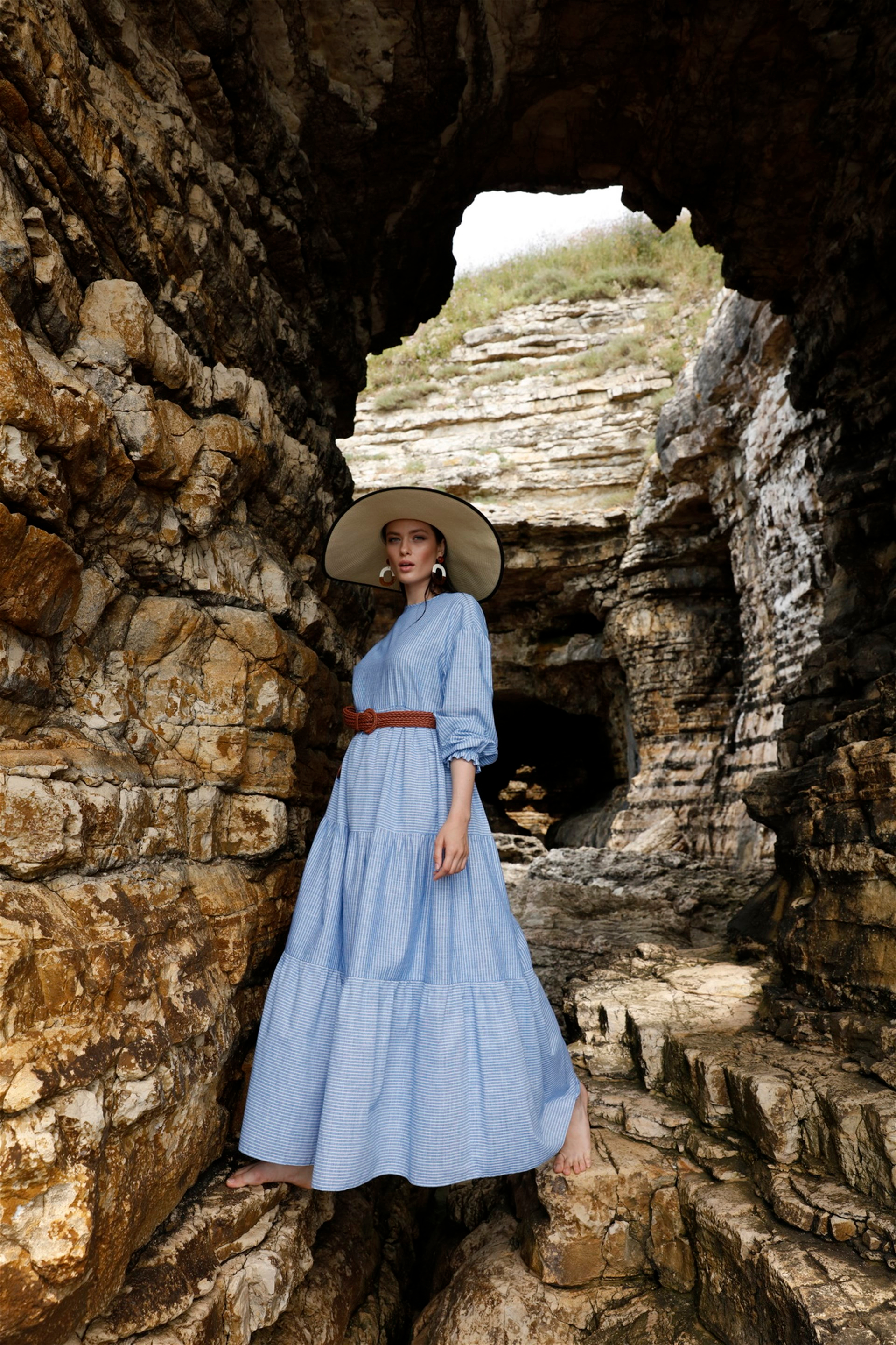 Çizgili Tam Boy Elbise-Mavi (201348M ELBİSE-11)