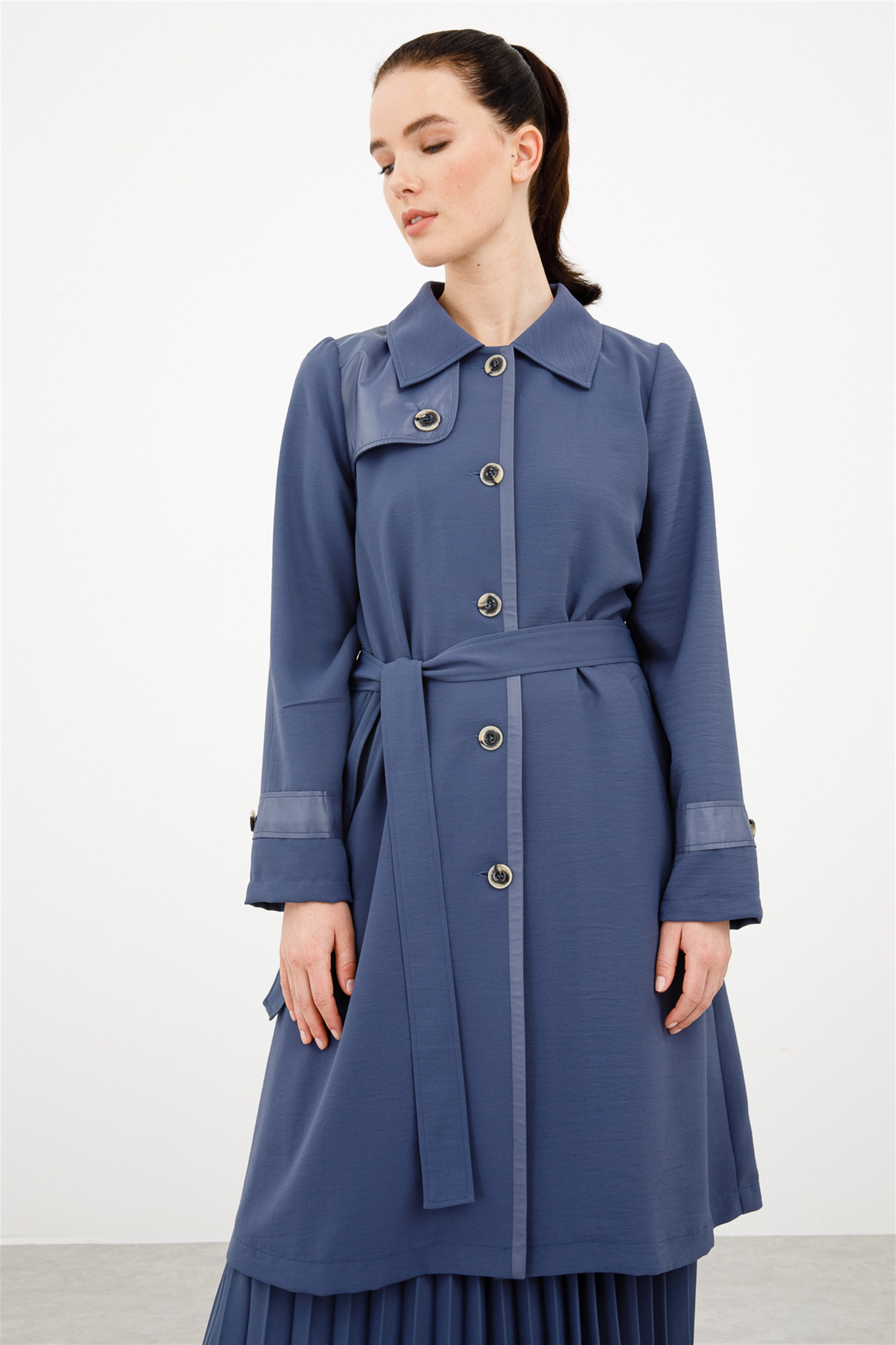 Çok Şık ve Spor Tek Düğmeli Kenar Detay Biyeli Trenç-İndigo (211851M TREÇKOT-44)