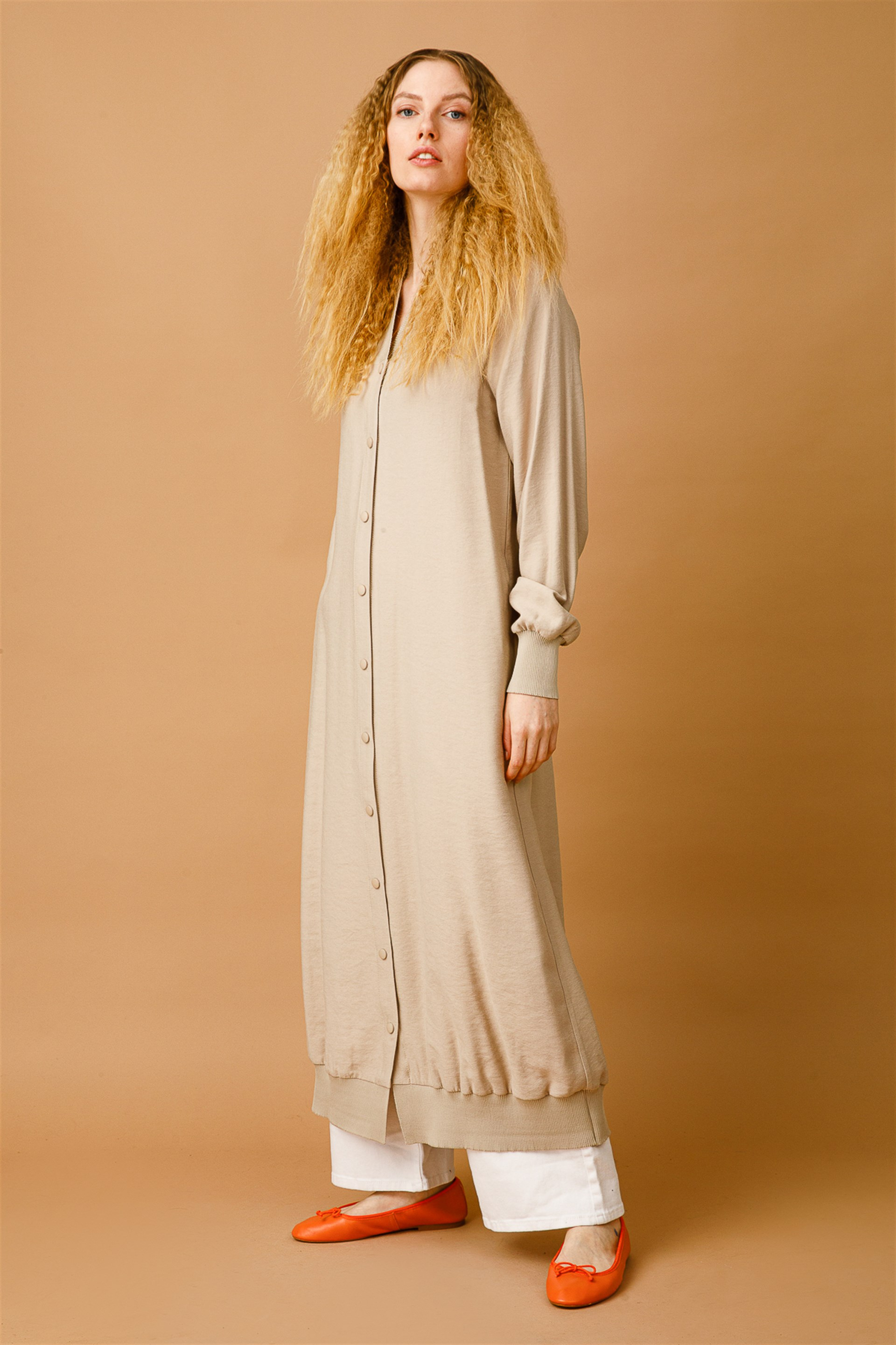 Elif Sade Spor Tam Boy Doğal Kumaş İçerikli Yakası ve Kolları Triko Detaylı Kap-Taş
