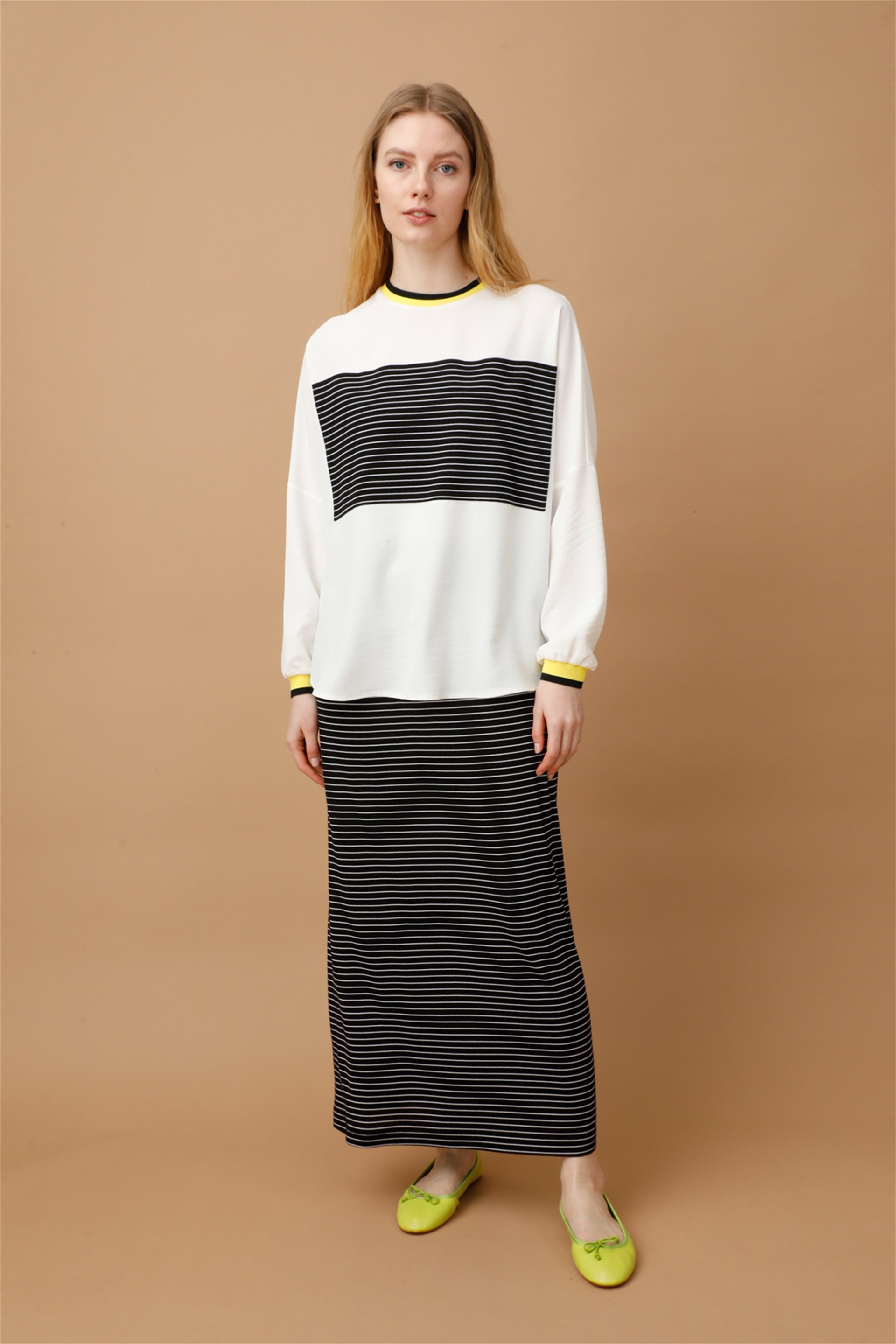 Eteği ve Bedeni Garni Penye Üstü Zor Kırışan Kumaş Spor Takım Üretim Ülkesi: Türkiye Sezon: 2022 İlkbahar Yaz Kumaş İçeriği: %100 Polyester Boy Uzunluğu: 78 cm Ürün Ölçüleri 38/40 Beden için: Tunik Göğüs 150 cm Boy uzunluğu:79 cm Bedenler arası 5 cm fark etmektedir. Etek Ürün Ölçüleri 38 Beden için: Bel 91 cm Bedenler arası 2 cm fark etmektedir. Manken Ölçüleri Giydiği Beden: 36 Boy: 175 cm