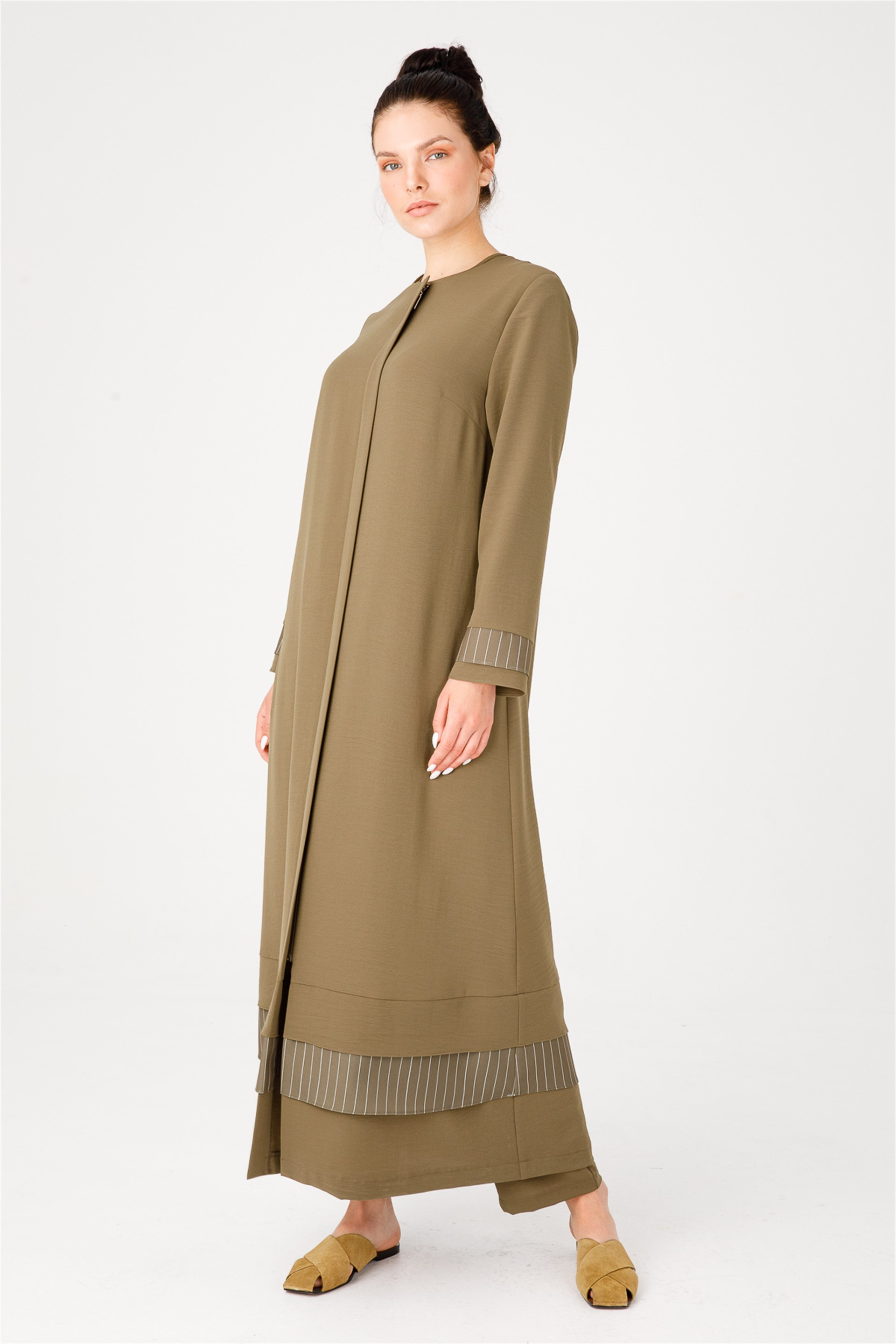 Etek Ucu Çizgi Desen Detaylı Spor Boy Kap Yakasız, önü fermuarlı, astarsız. Etek ucu çizgi desenli sizi gündelik hayatınızda şık ve rahat hissettirecek şekilde tasarlanmış zor kırışan, nefes alan kumaştan tam boy kap * Beden seçimi yapmadan önce lütfen bedenler üzerinde yer alan renk kutucuklarına tıklamayı unutmayınız! Üretim Ülkesi: Türkiye Sezon: 2021 İlkbahar Yaz Kumaş İçeriği: %100 Polyester Boy Uzunluğu: 132 cm Manken Ölçüleri Giydiği Beden: 38 Boy: 176 cm Göğüs: 88 cm , Bel: 66 cm , Basen: 99 cm