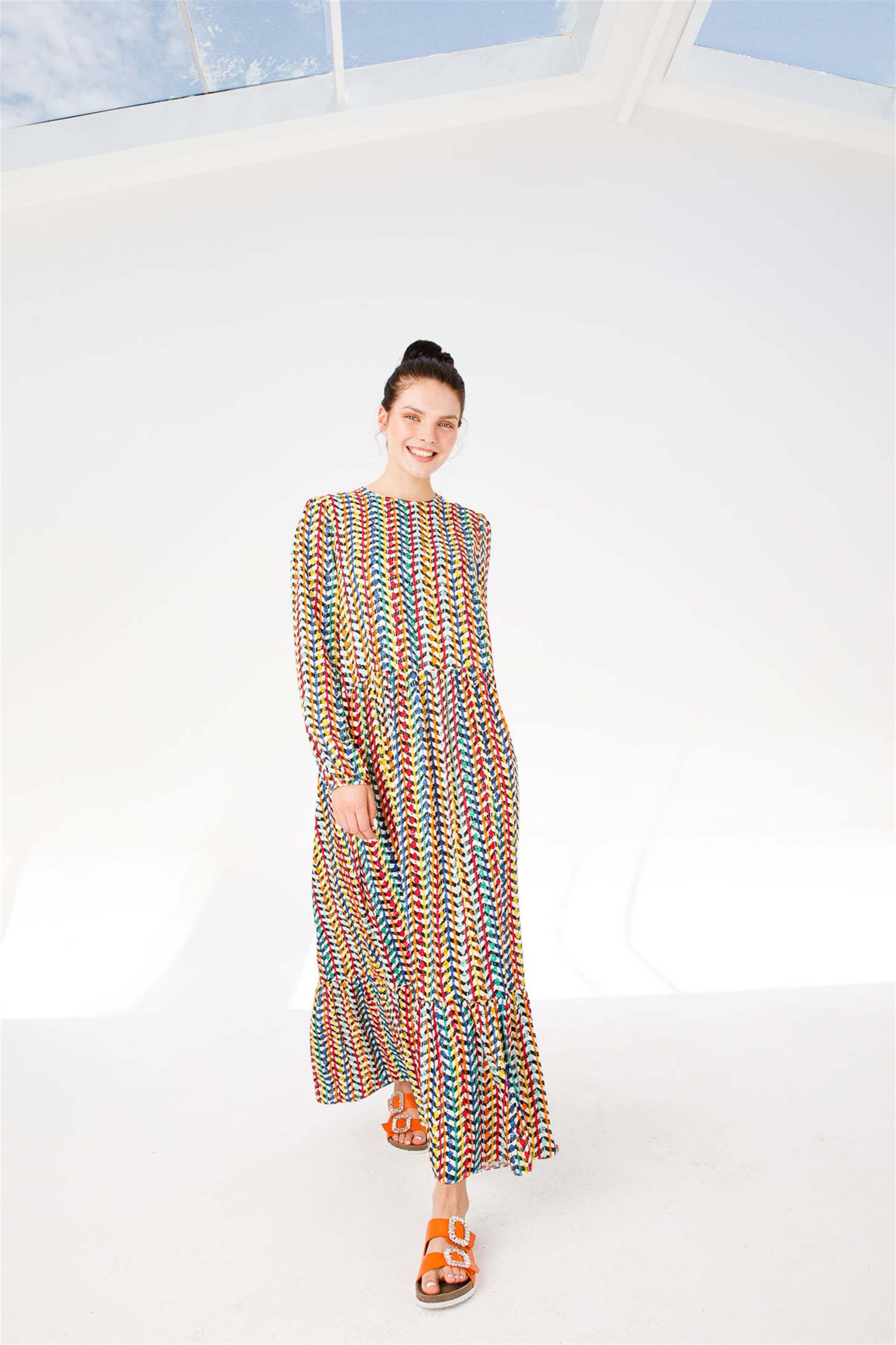 Etek ve Kol Ucu Büzgülü Doğal Elyaf (Viskon) Nefes Alan ve Zor Kırışan Kumaştan Elbise-Gök Kuşağı (211341M ELBİSE-83)