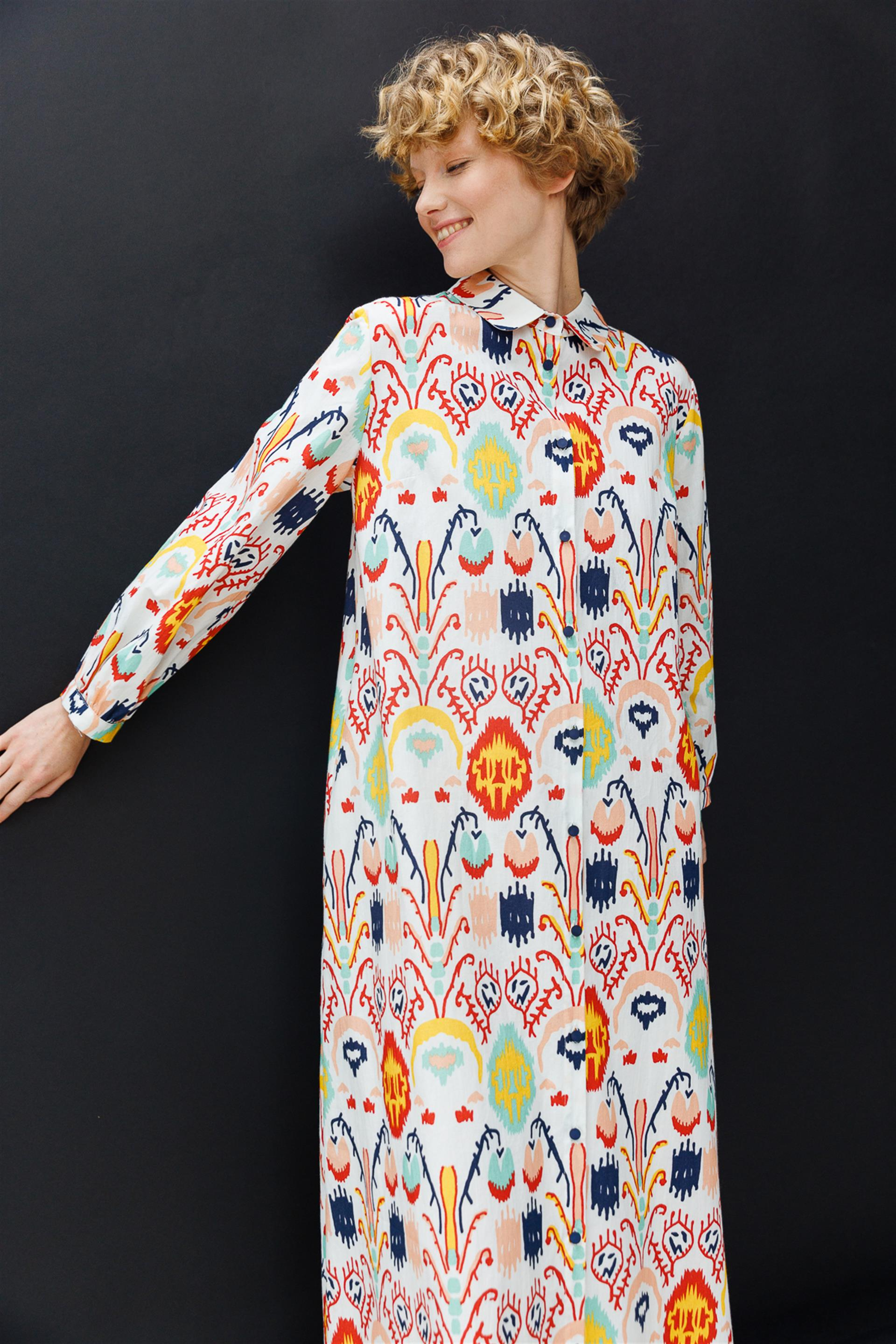 Etnik Desen Tam Boy Hafif ve Nefen Alan Kumaş Elbise-Kırmızı (231311M ELBİSE-41)