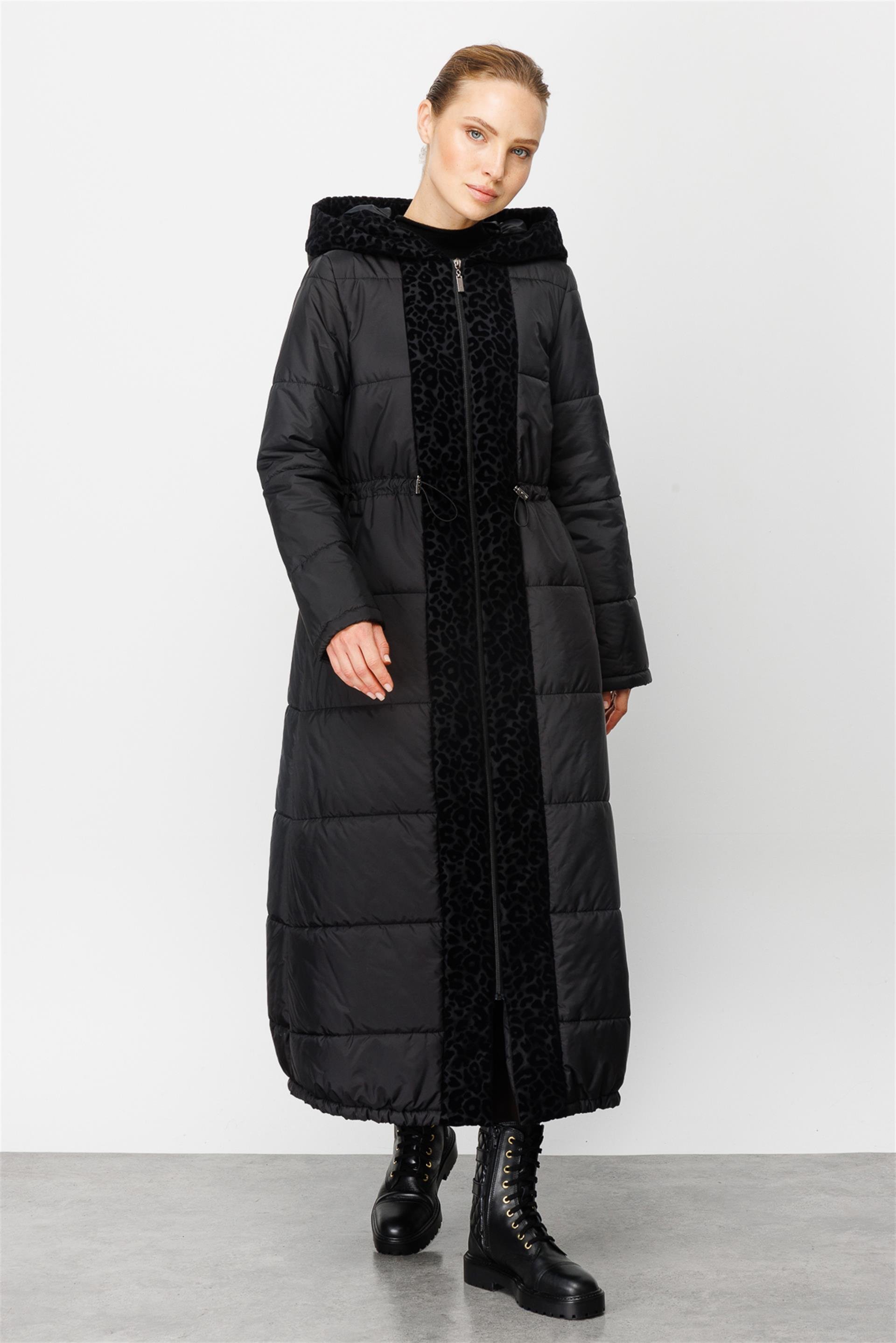 Flok Desen Detaylı Tüm Beden Kapitone Dolgulu Spor Manto Kaban-Siyah (232584M KABAN-01)