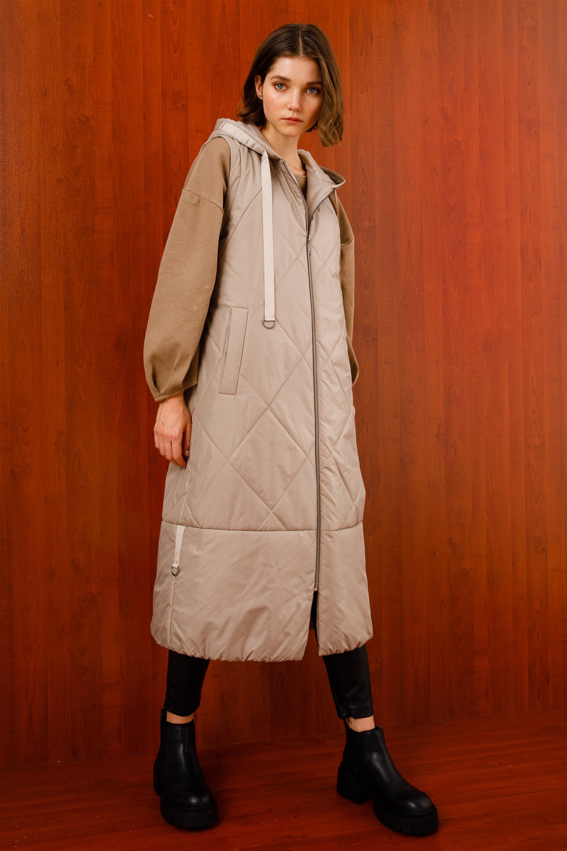 Grogren Detaylı Kapüşonlu Kalın Şişme Yelek-Taş (212708M YELEK-12)