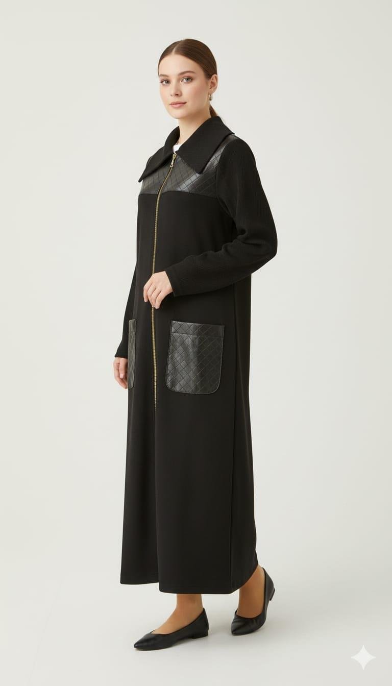 Hasır Suni Deri Detaylı Krep Doku Mevsimlik Ferace Kap