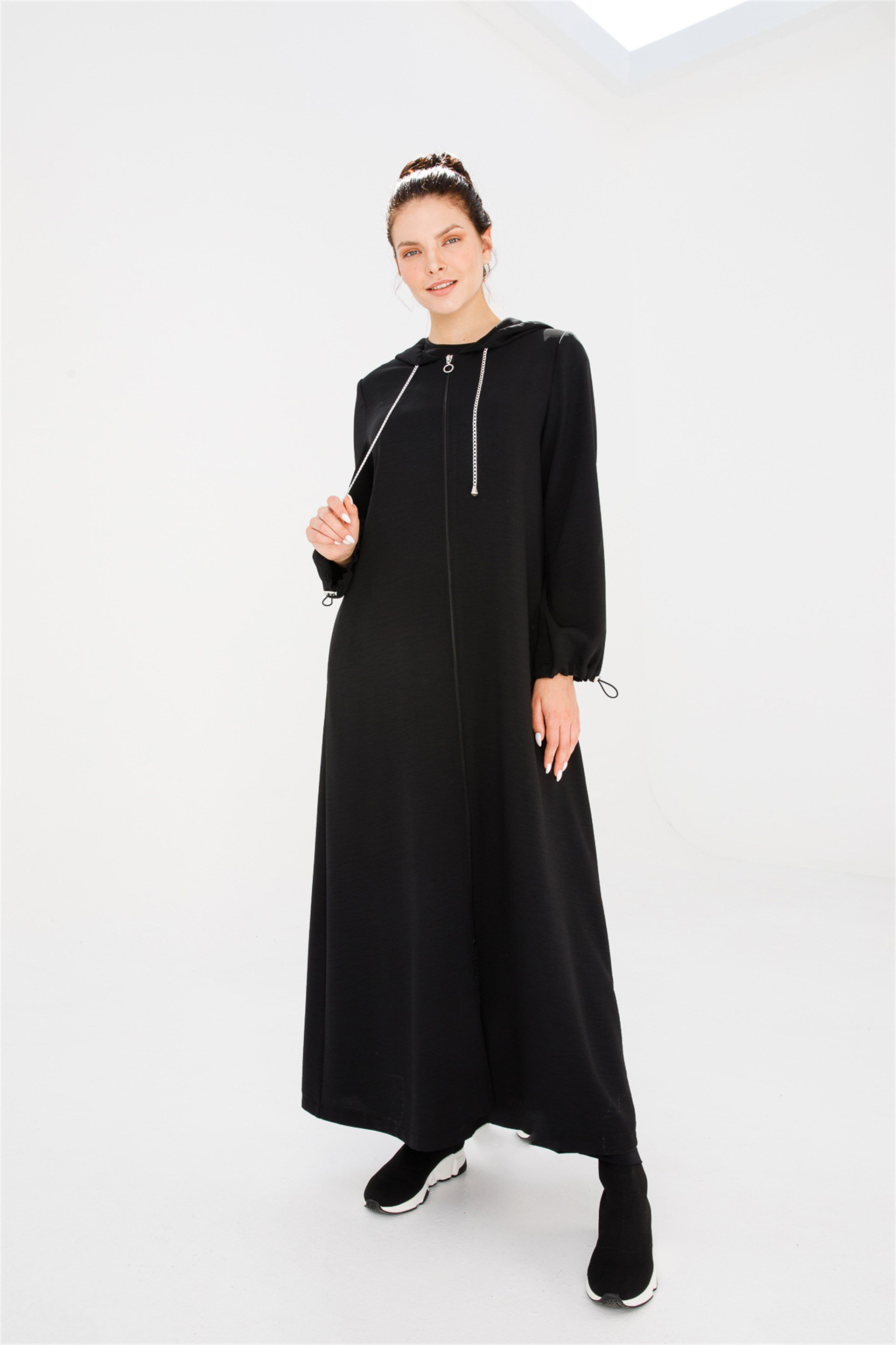 Kapüşonlu Gümüş Zincir Detaylı Sade ve Şık Görünmenizi Sağlayacak Spor Tam Boy Kap-Siyah (211895M PARDESÜ-01)