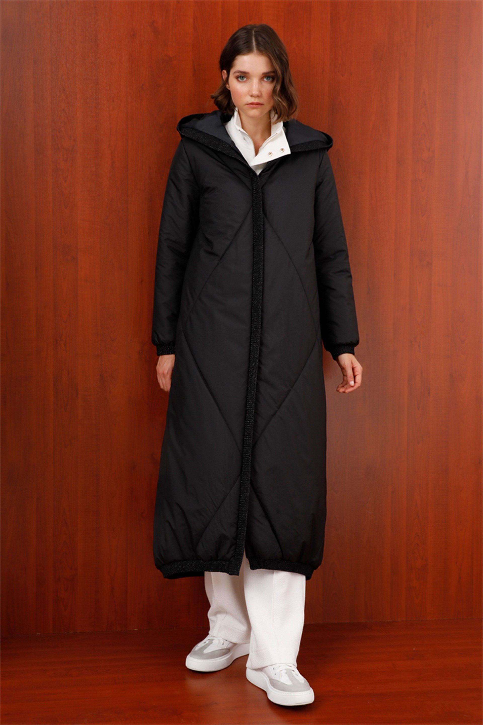 Kapüşonu Ön Patı ve Kol Uçları Simli Triko Detaylı Dolgulu Tam Boy Kapitone Manto-Siyah (212576M KABAN-01)