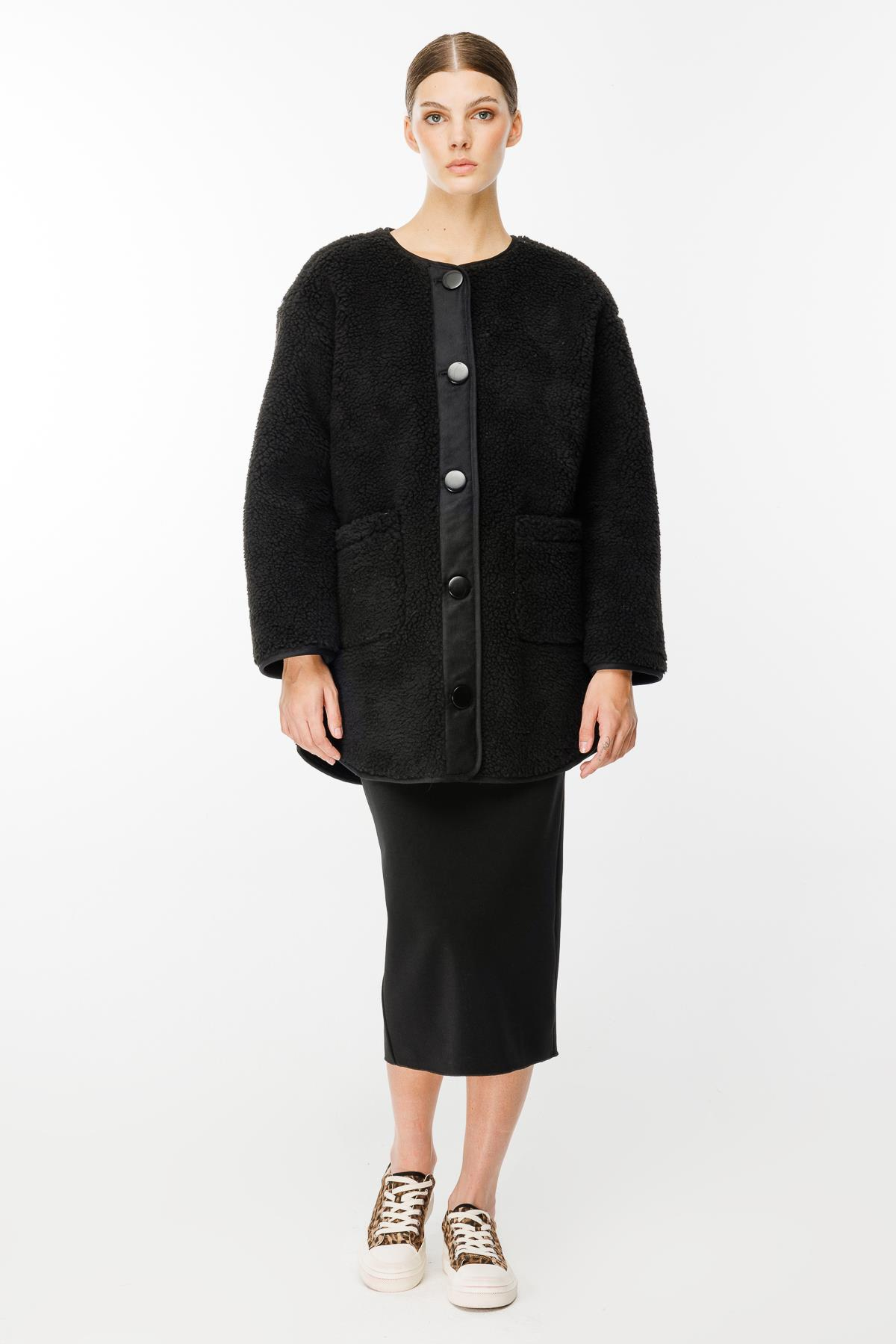 Kısa Kaban Düz Peluş Mont Düğmeli Cep Detaylı-Siyah (242103N-01)