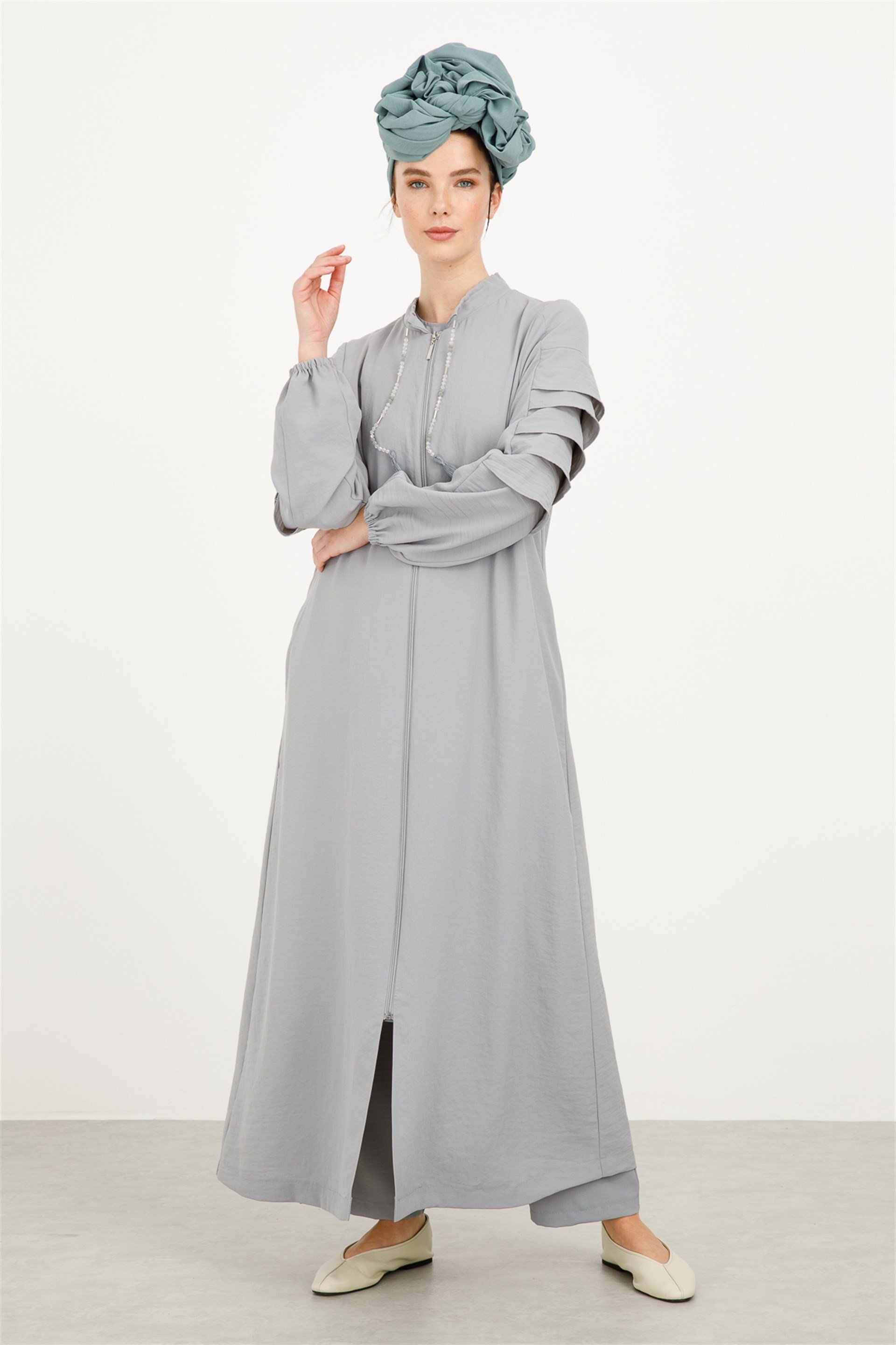 Kolları Kat Detaylı, Yakası Boncuk Aksesuarlı Tam Boy Kap-Gri (211862M PARDESÜ-18)