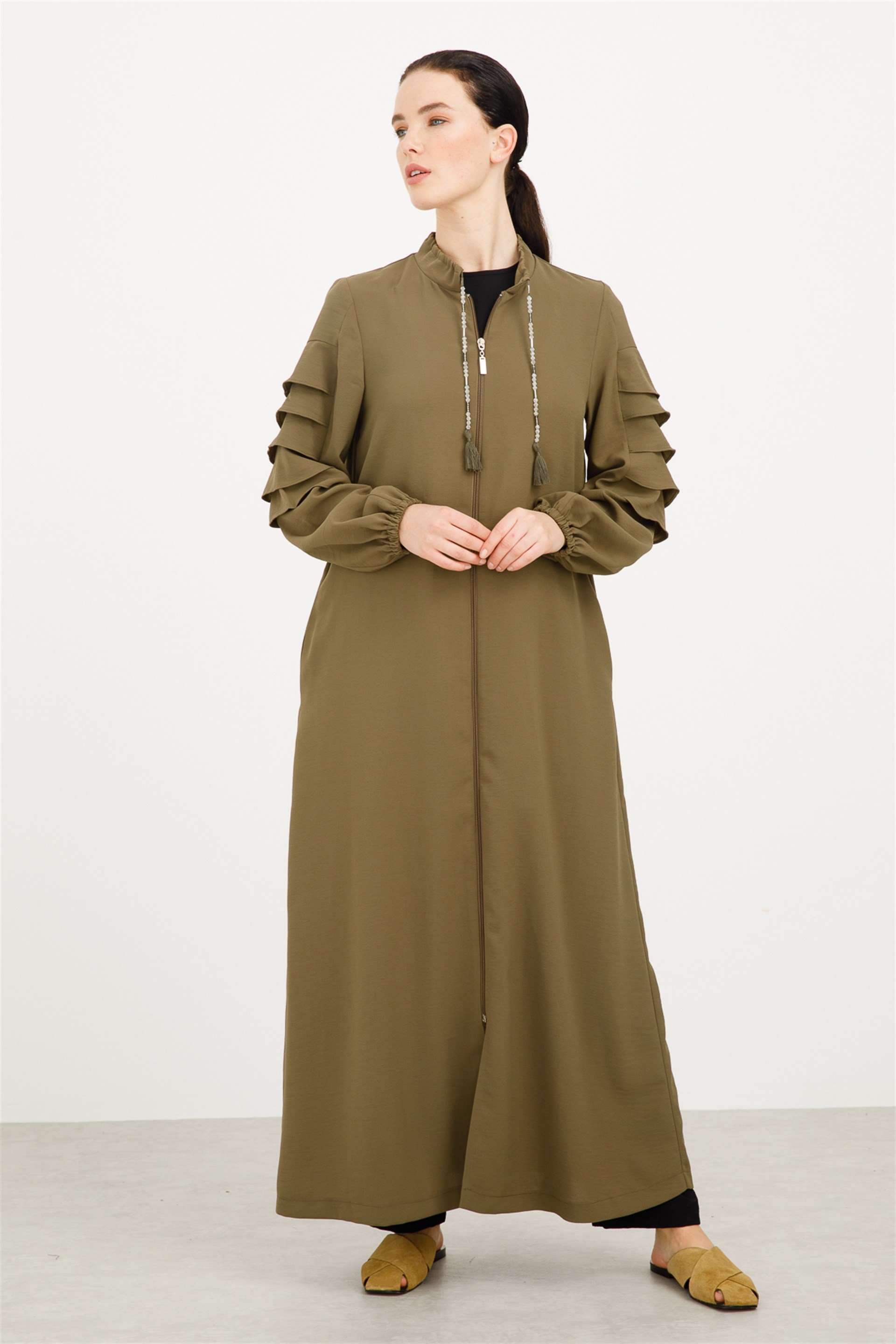 Kolları Kat Detaylı, Yakası Boncuk Aksesuarlı Tam Boy Kap-Haki