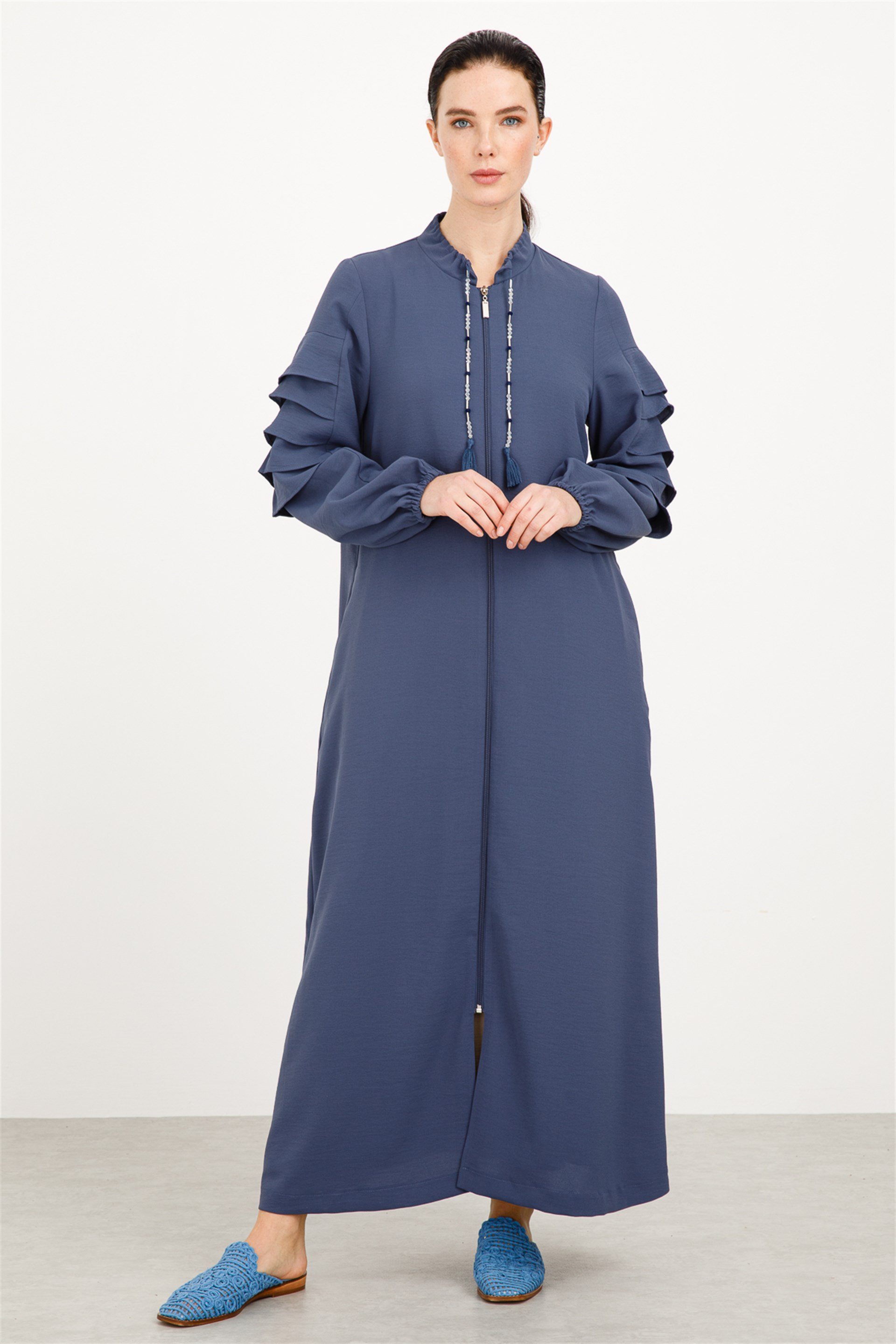 Kolları Kat Detaylı, Yakası Boncuk Aksesuarlı Tam Boy Kap-İndigo (211862M PARDESÜ-44)