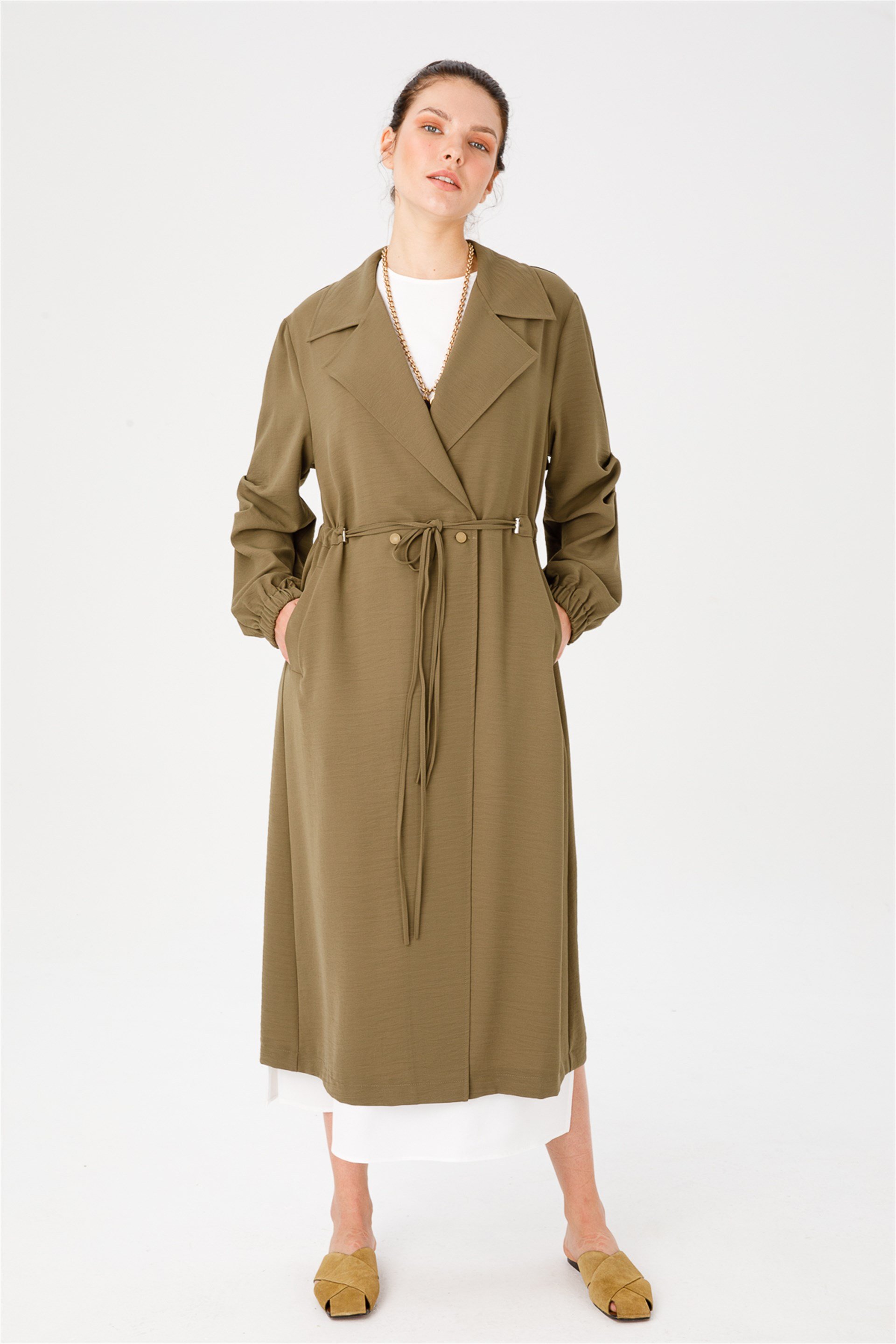 Kolları Pile Detaylı Spor ve Şık Kap (Trench)-Haki