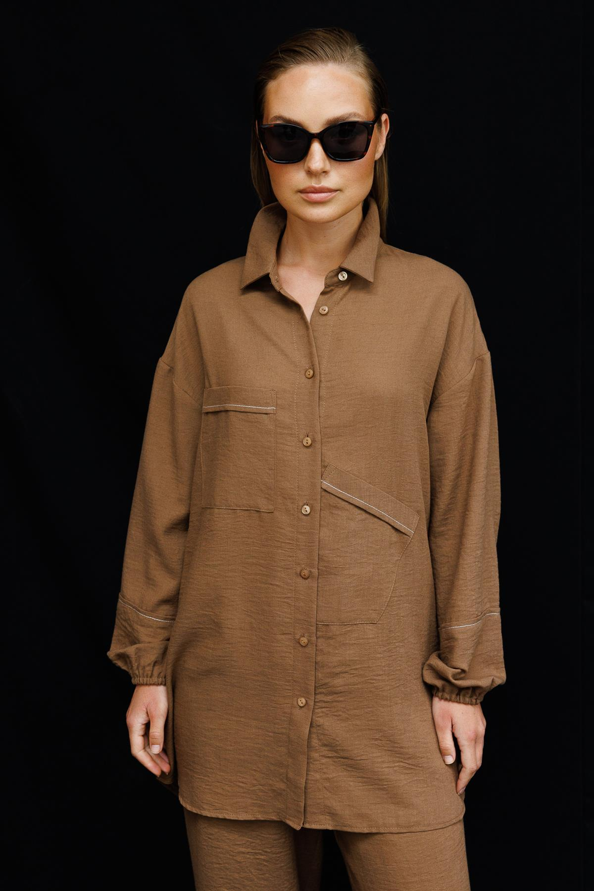 Kontrast Dikiş Detaylı Keten Dokuma Pantalonlu Spor Takım-Vizon (241824M TAKIM-16)