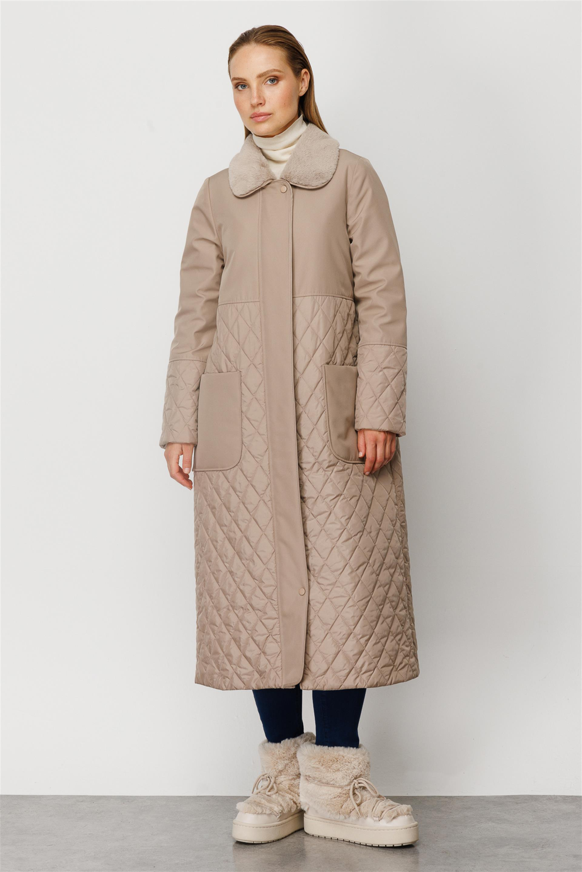 Kürk ve Garni Detaylı Tüm Beden Kapitone Dolgulu Spor Manto Kaban-Taş (232805M KABAN-12)