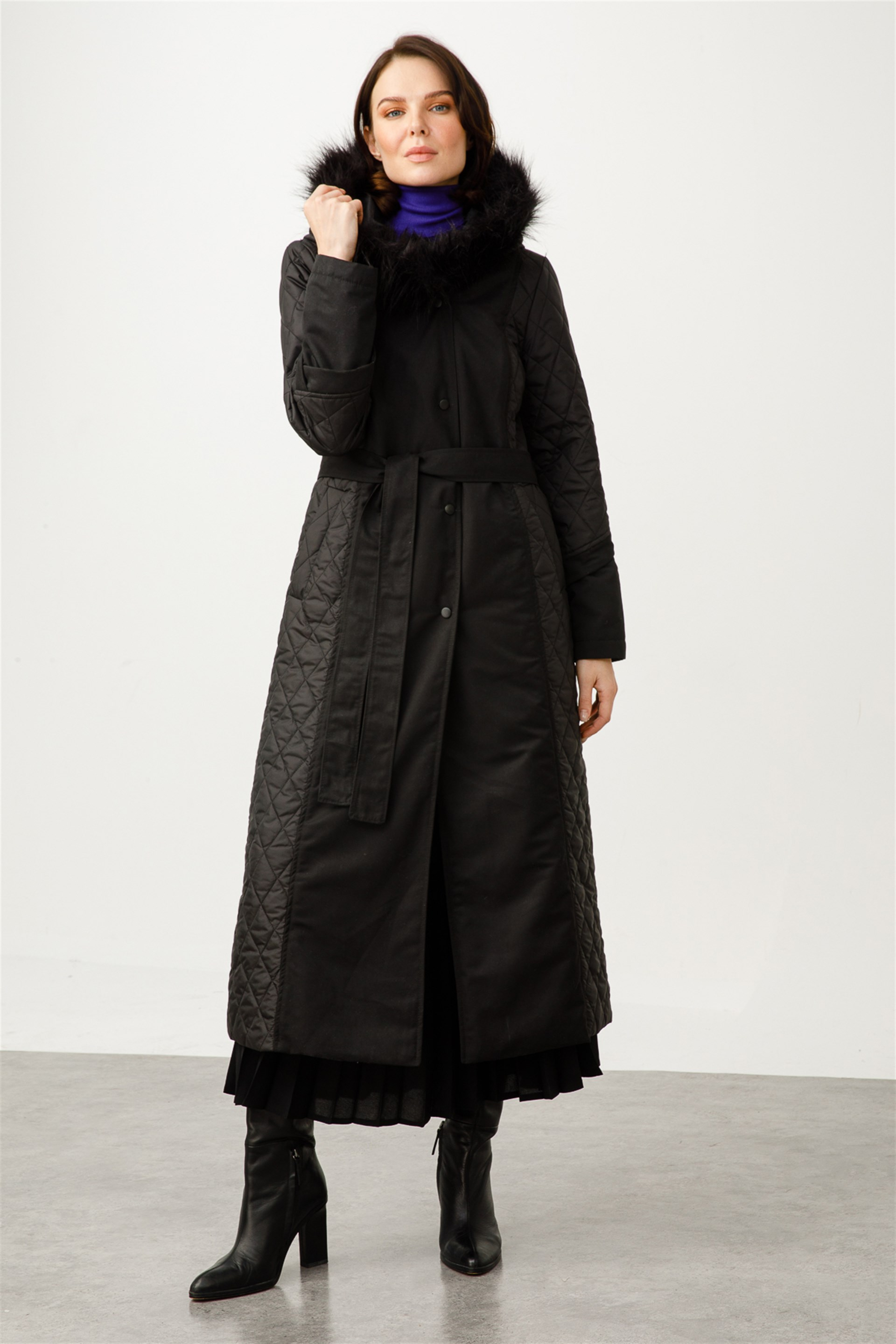 Kürklü Helene Kapitone Dolgulu Elit Manto-Siyah