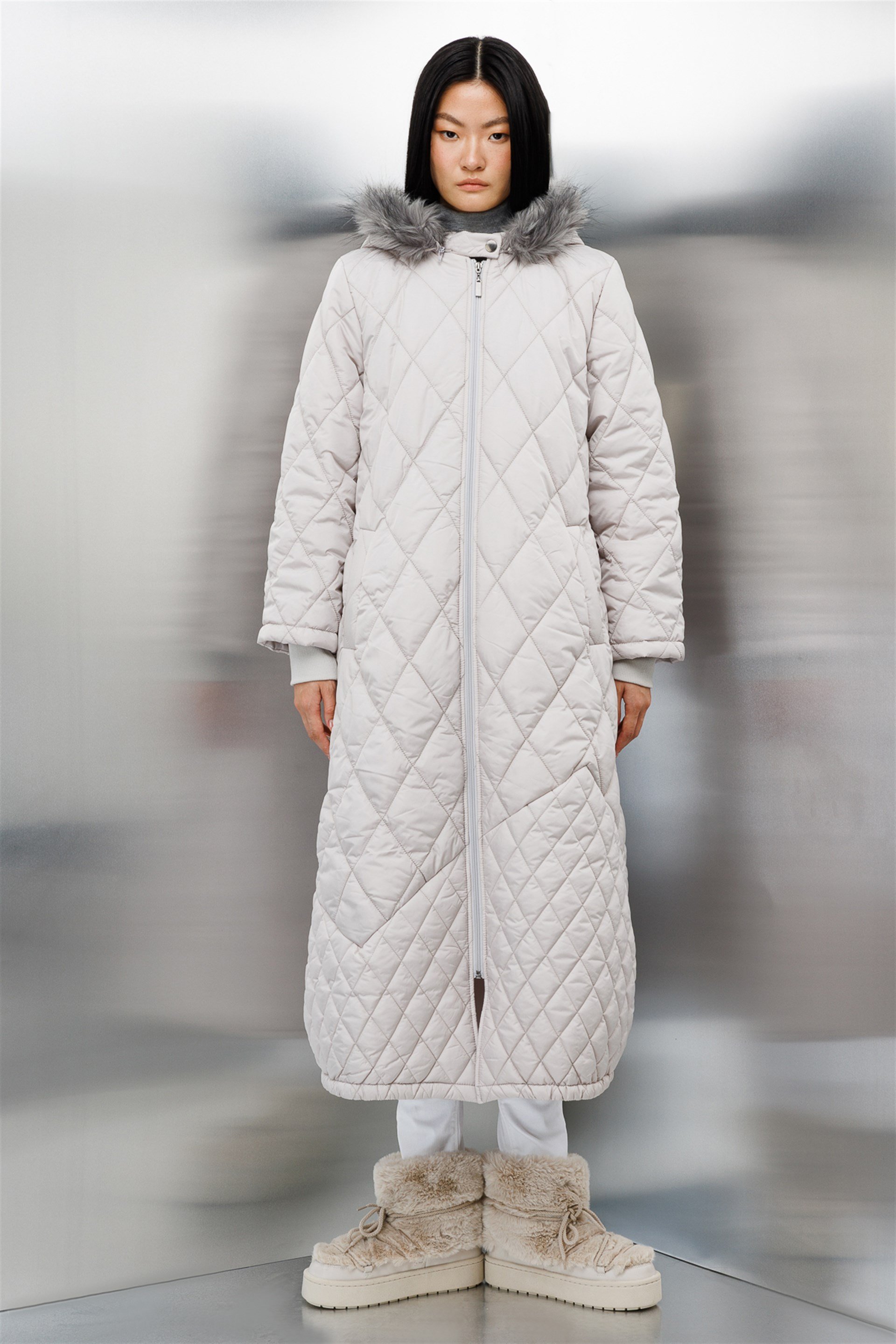 Kürklü Kolları Triko Detaylı Spor Kapitone Şişme Manto-Gümüş