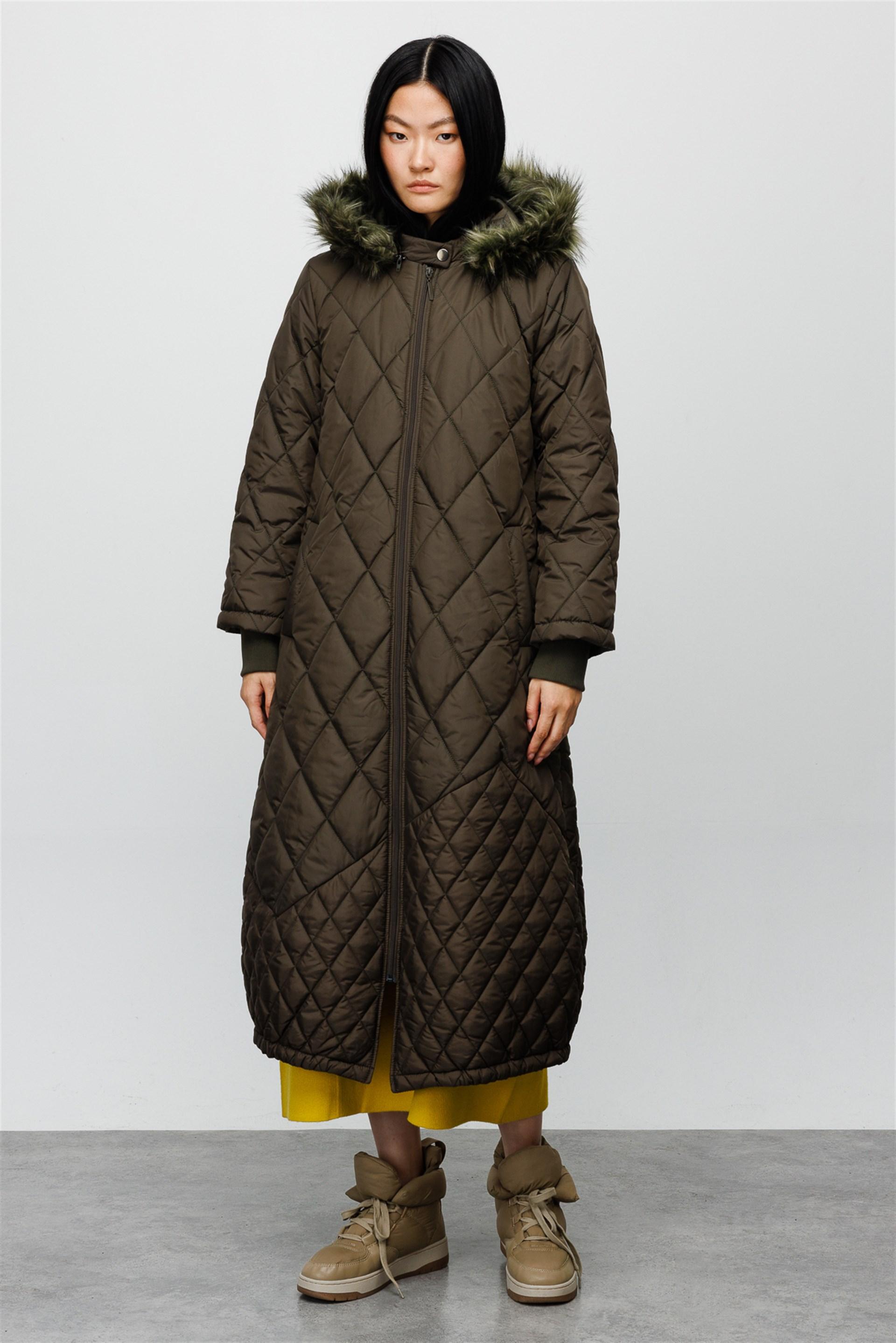 Kürklü Kolları Triko Detaylı Spor Kapitone Şişme Manto-Haki (222539M KABAN-20)