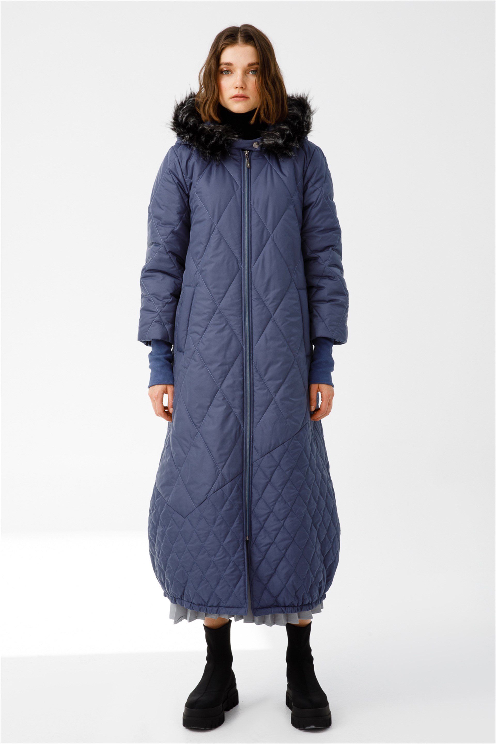 Kürklü Kolları Triko Detaylı Spor Kapitone Şişme Manto-İndigo (222539M KABAN-44)