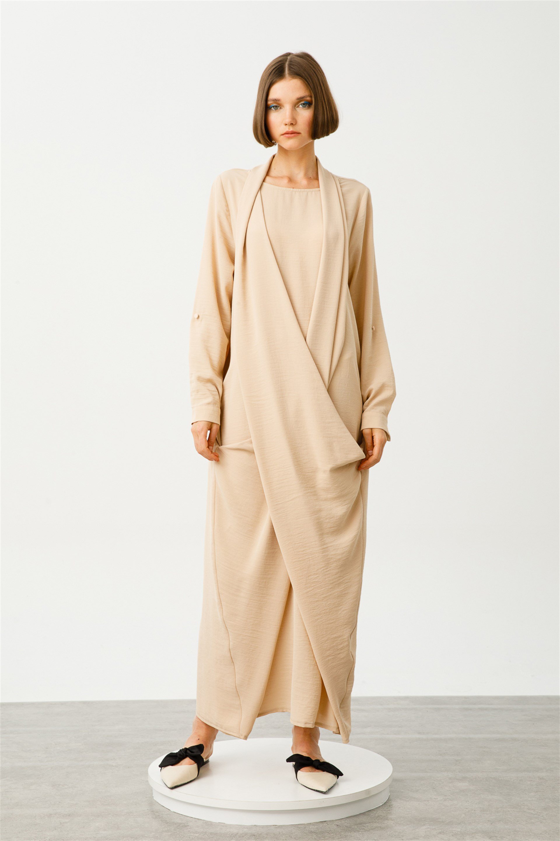 Laila Şal Yaka Tam Boy Zarif Elbise-Taş
