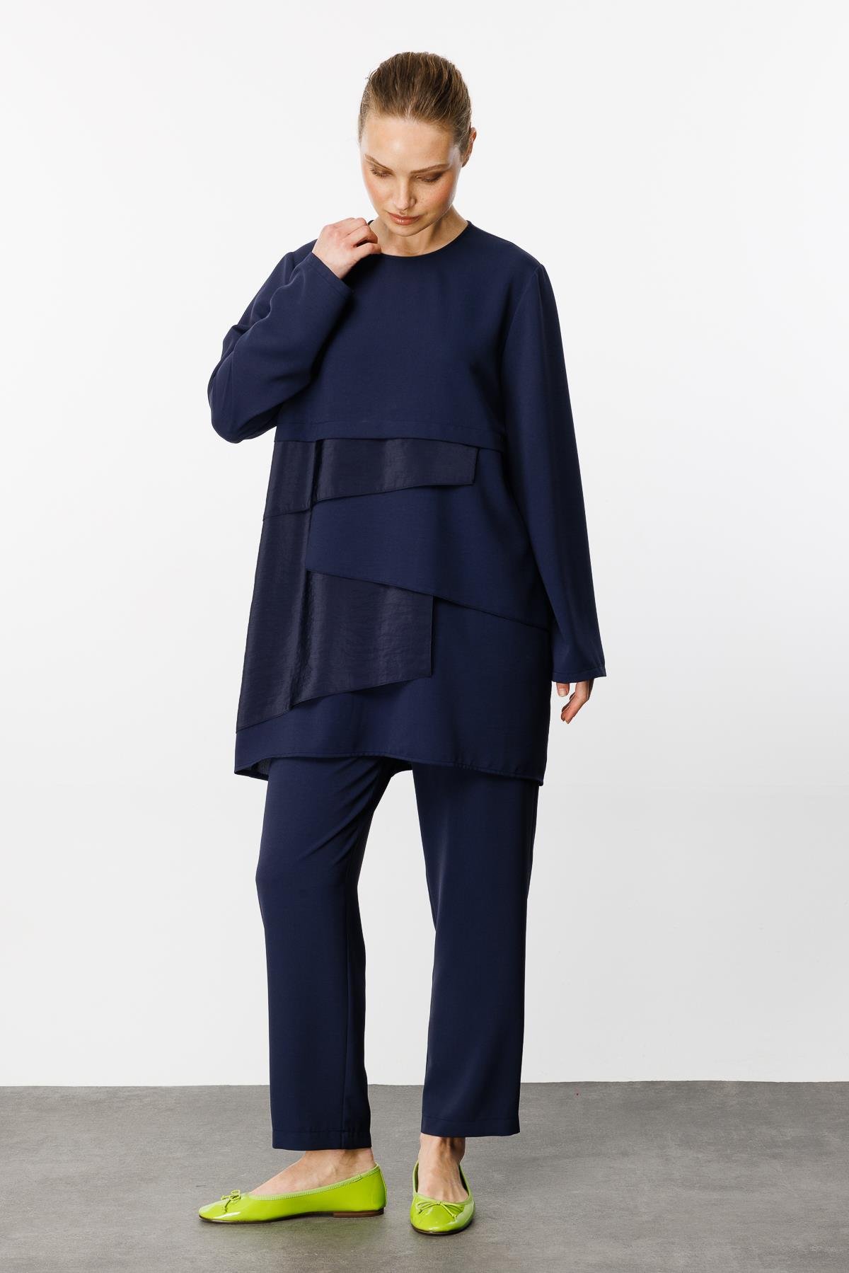 Layer Asimetrik Garni Detaylı Zor Kırışan Nefes Alan Özel Dokuma Kumaş İkili Takım
