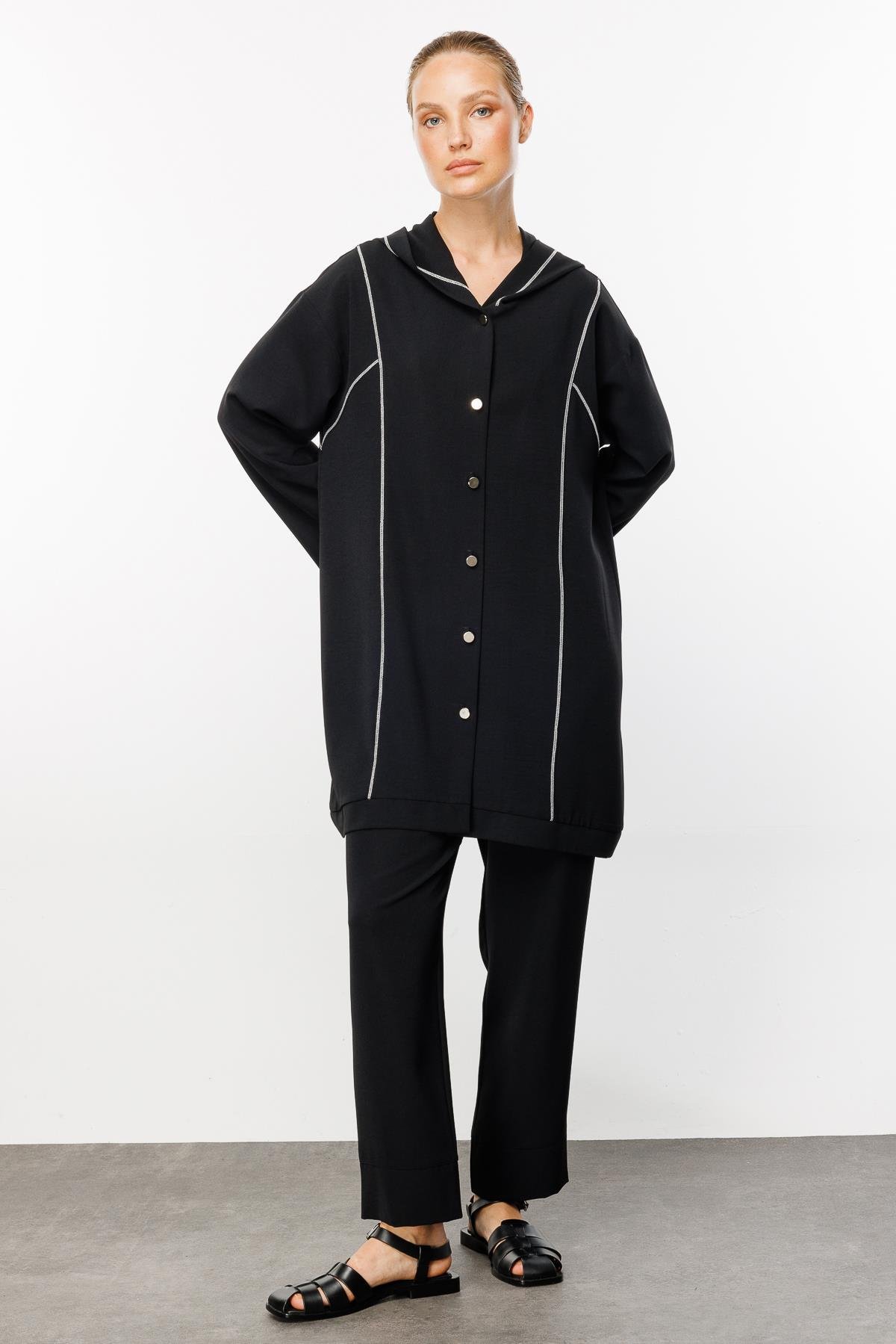 Mid Tunik Pantolon Özel Dokuma Kumaş Spor Kontrast Dikiş Detaylı Takım-Siyah (241819M TAKIM-01)