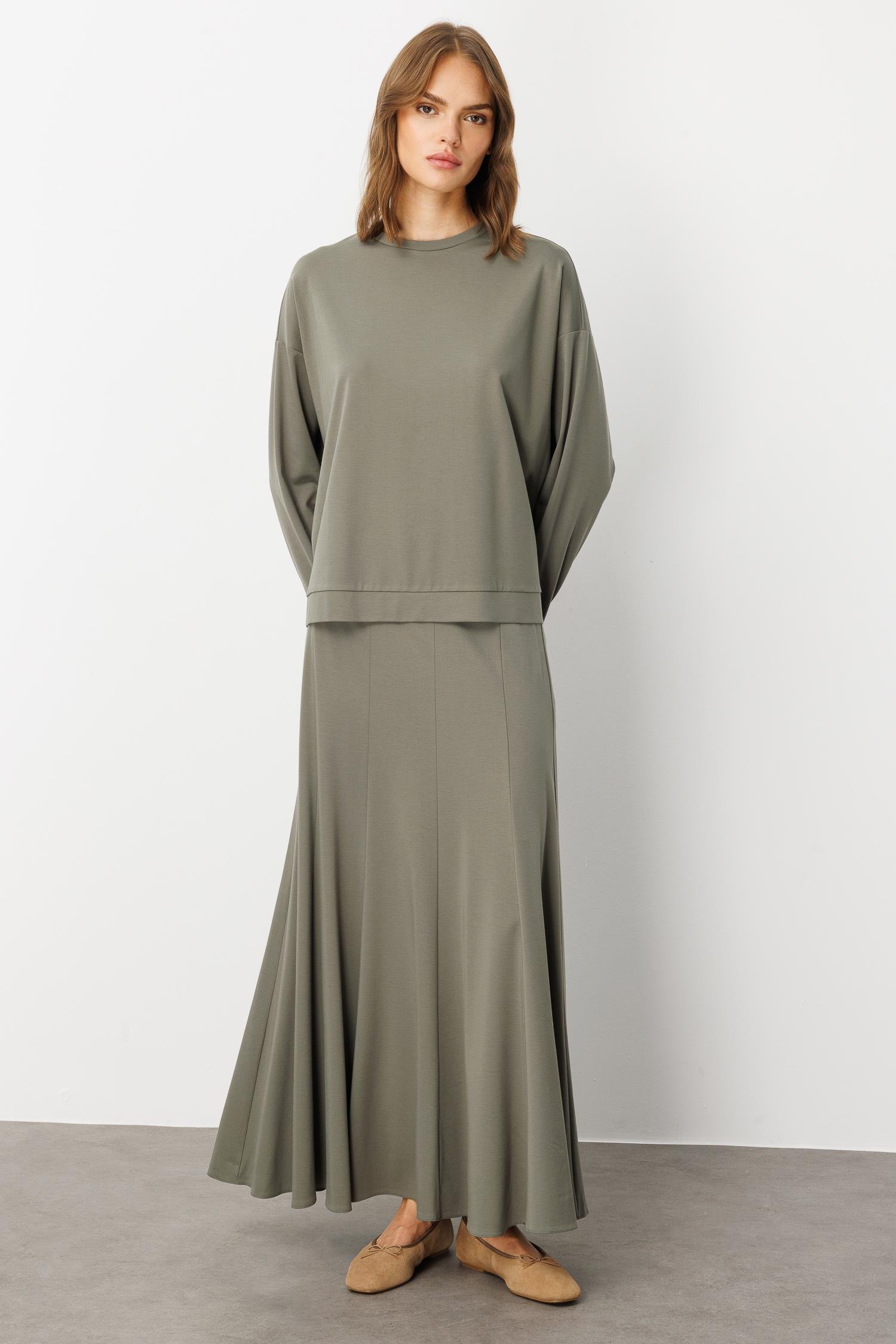 Mybch Örme Ekstra Dökümlü Yumuşak Dokulu Parçalı Etek Kombinli Zamansız Takım-Haki (252849M ETEKLİ KOMBİN-20)