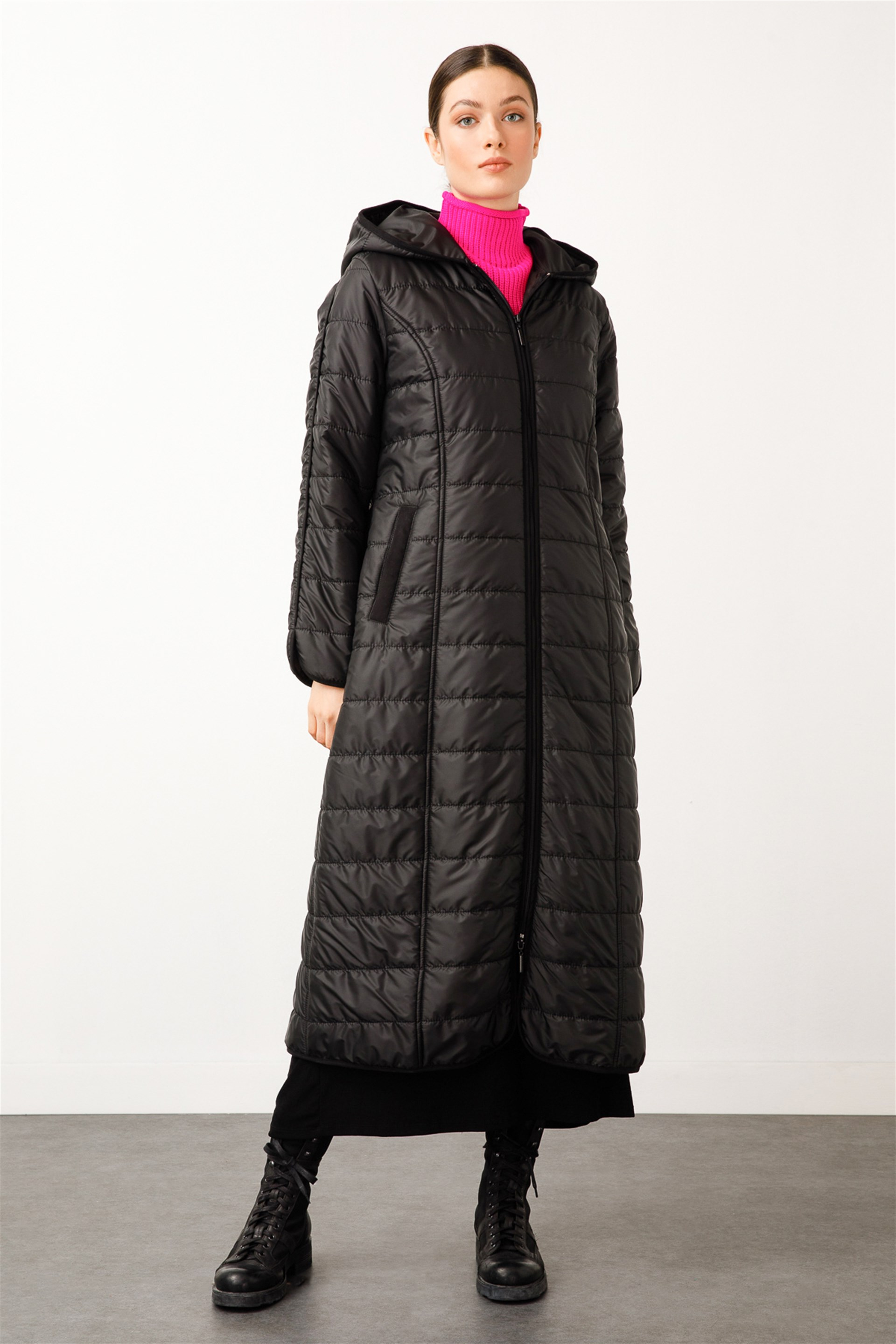 Önü Fermuarlı Kenar Biyeleri Cepleri Süet Mixli Uzun Kapüşonu Şişme Mont-Siyah (202822M KABAN-01)