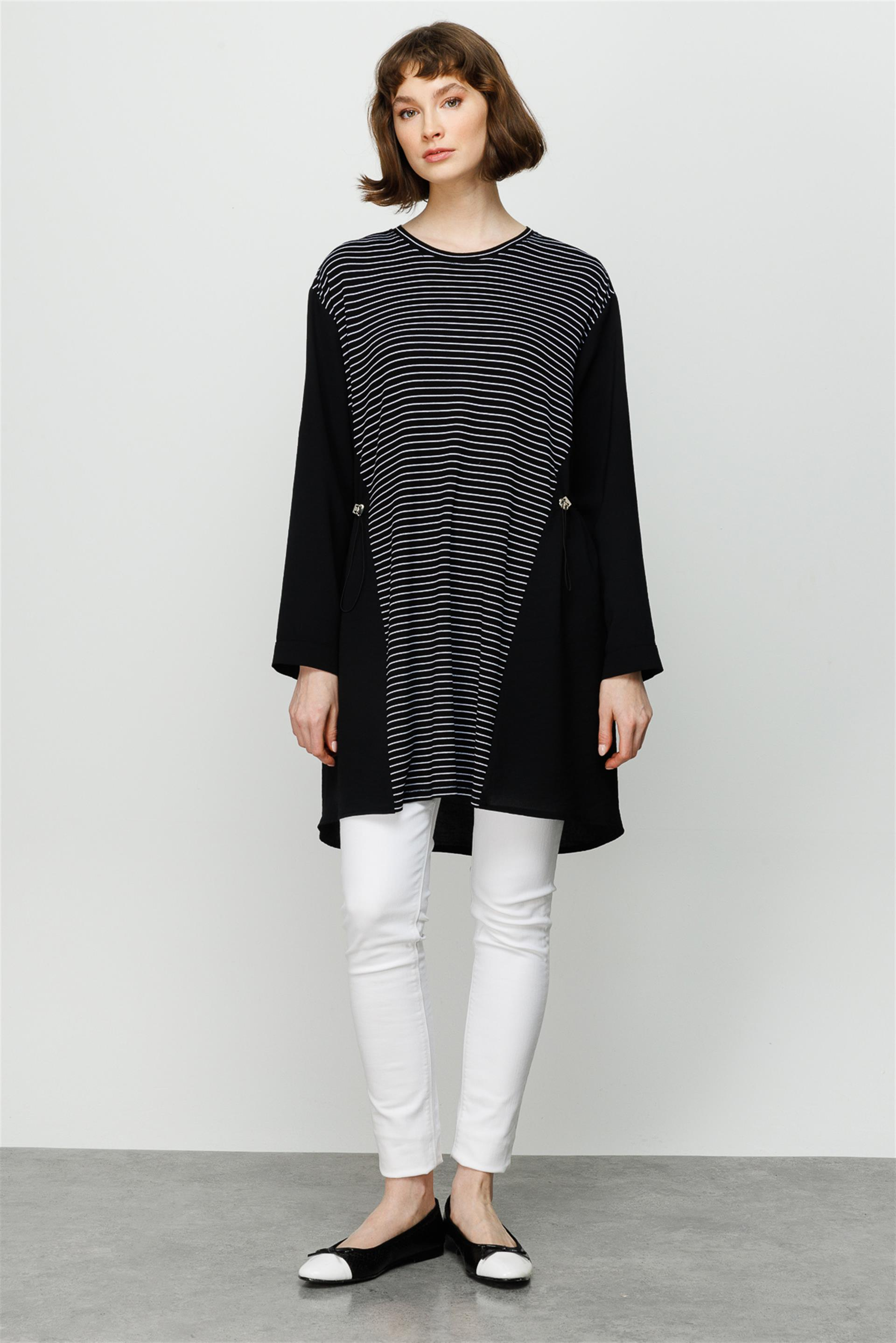 Örme Çizgi Detaylı Belden Büzgülü Rahat Kullanıma Uygun Kap-Tunik-Siyah