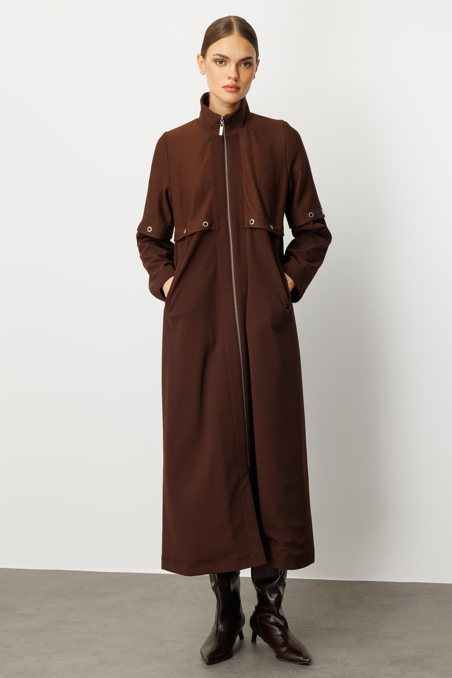 OTTO VE KREP DOKU MİX ASTARLI ALLER GARNİ AKS DETAYLI MEVSİMLİK ZAMANSIZ TRENCH/KAP-Kahve
