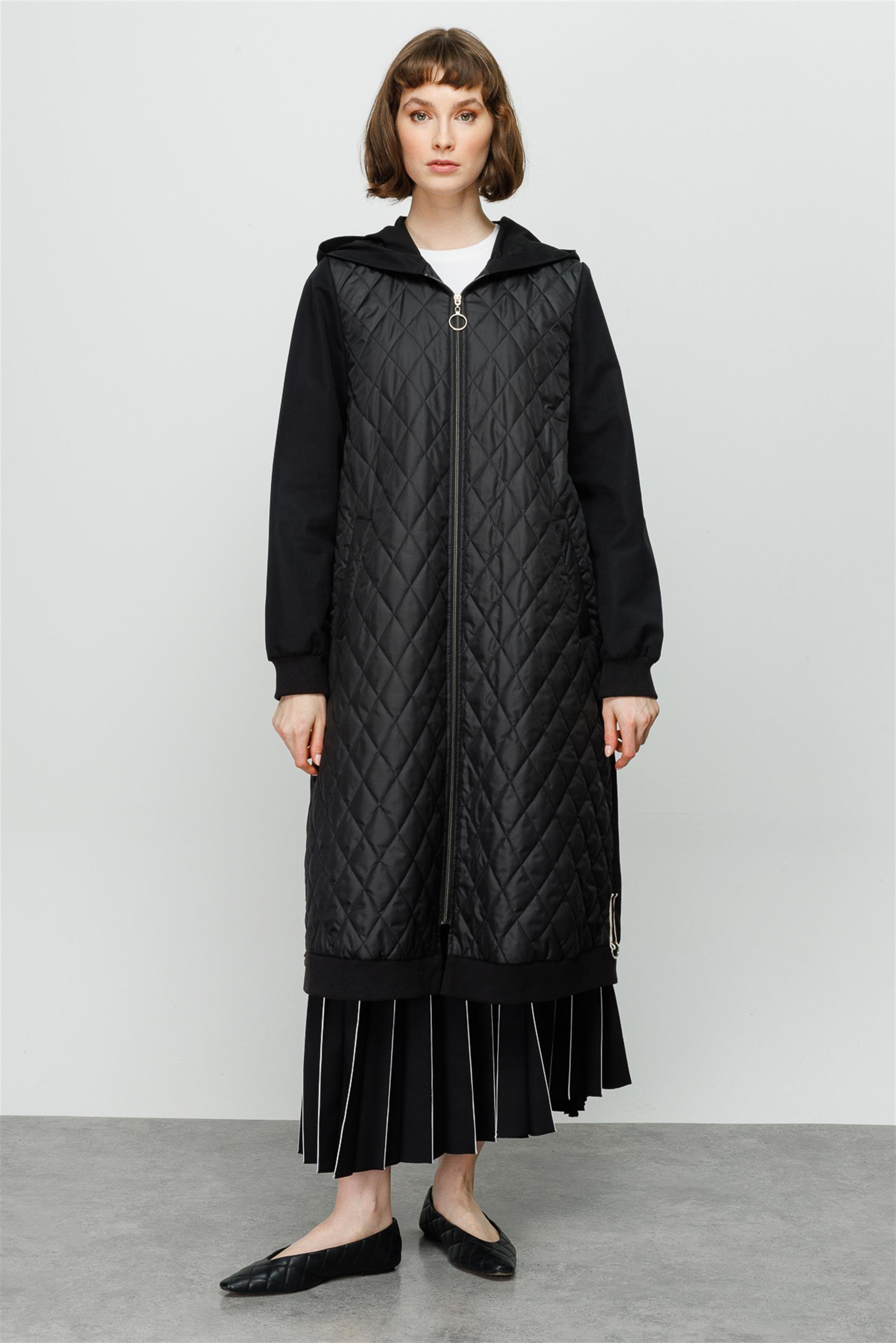 Özel Olarak Bahar için Kapitone ve Soft Trench Kumaş ile Üretilmiş Trench Kap-Siyah (231528M İŞLEMELİ KAP-01)