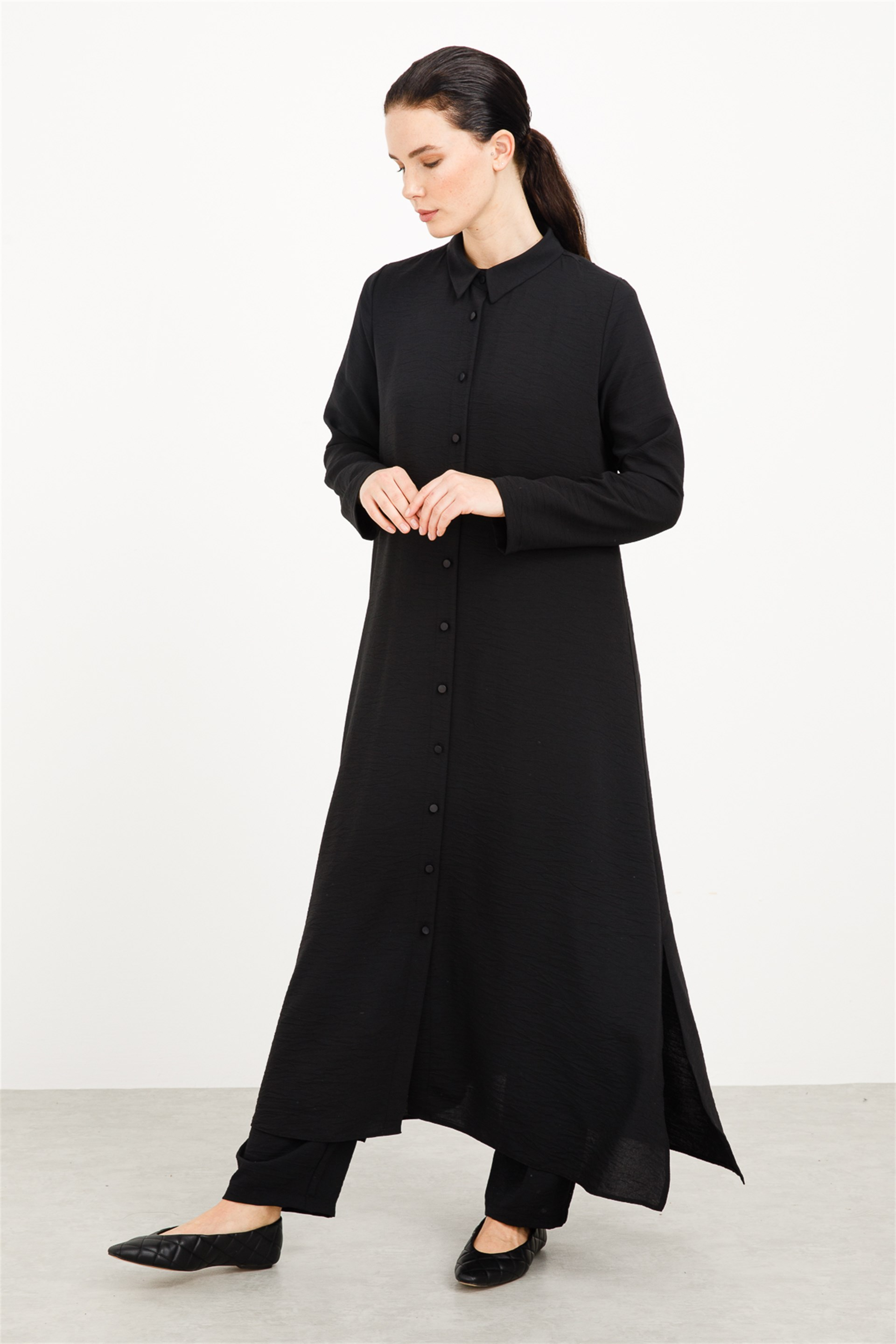 Pelerini Puantiye Detaylı Tam Boy Basic Spor Tunik Kap-Siyah