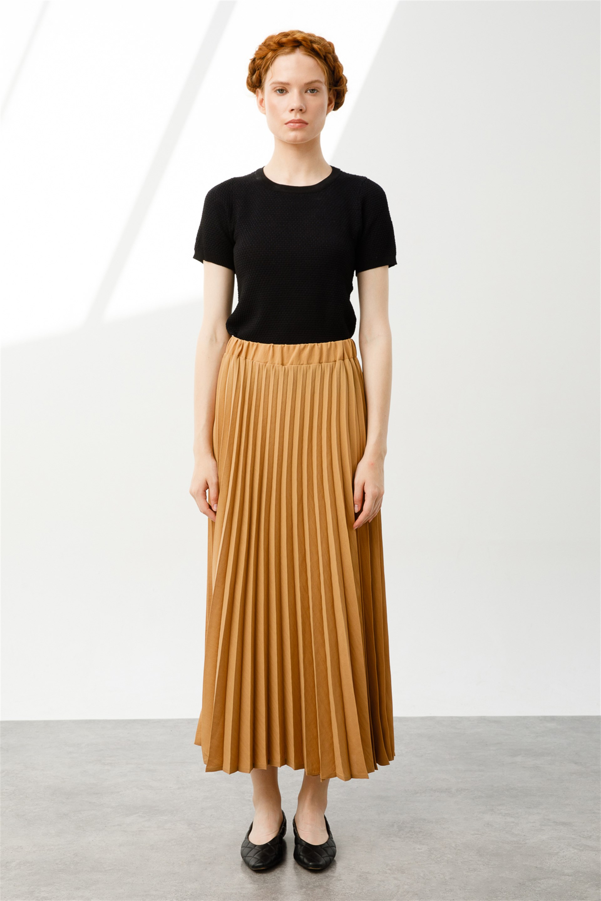 Piliseli Beli Lastikli Etek-Camel (221200M PİLİSE ETEK-08)