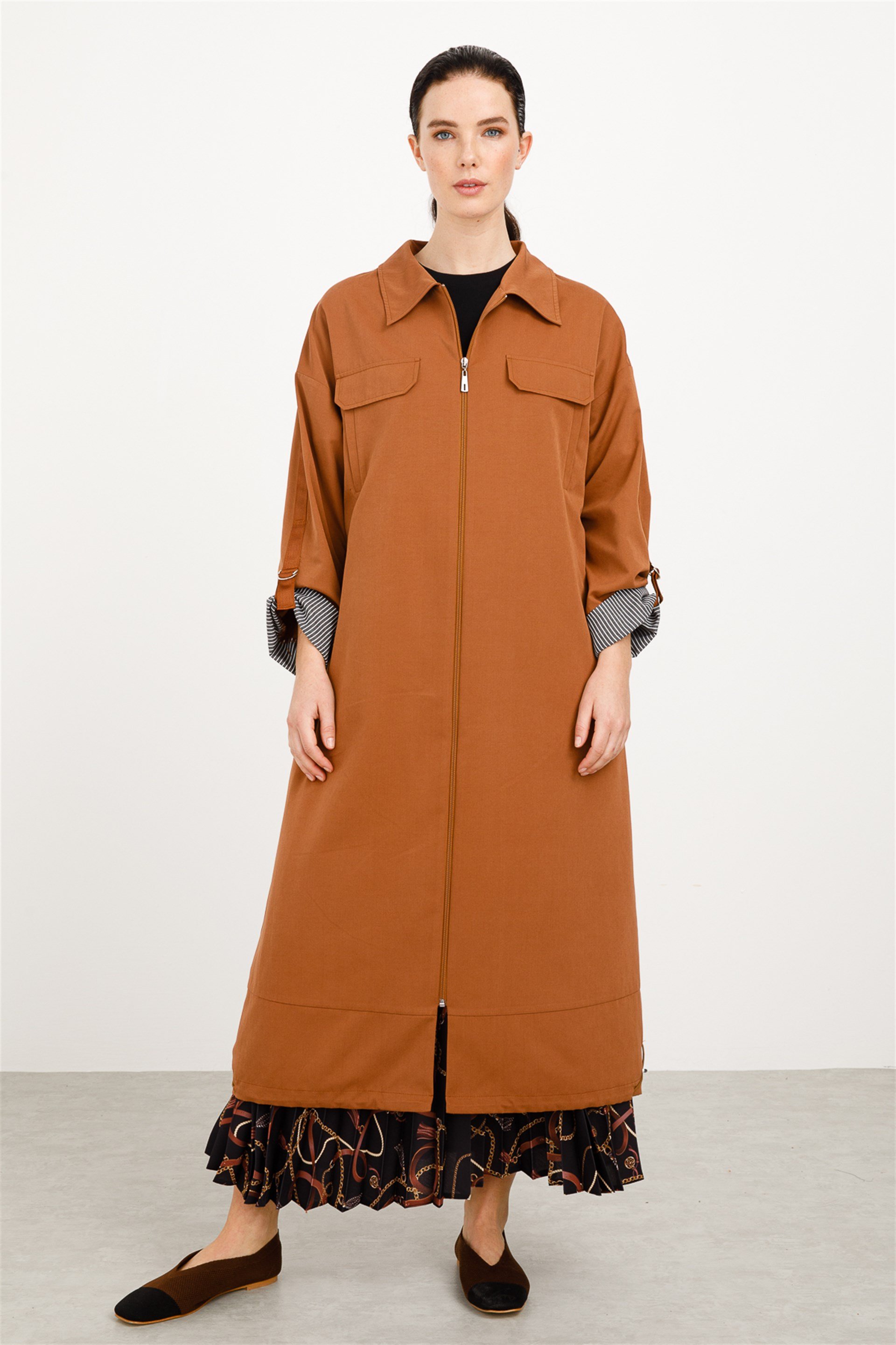 Rüzgar Geçirmez ve Su Tutmaz Fonksiyonel Hafif Pamuklu Kumaştan Spor Boy Trençkot-Camel (211548M TREÇKOT-08)