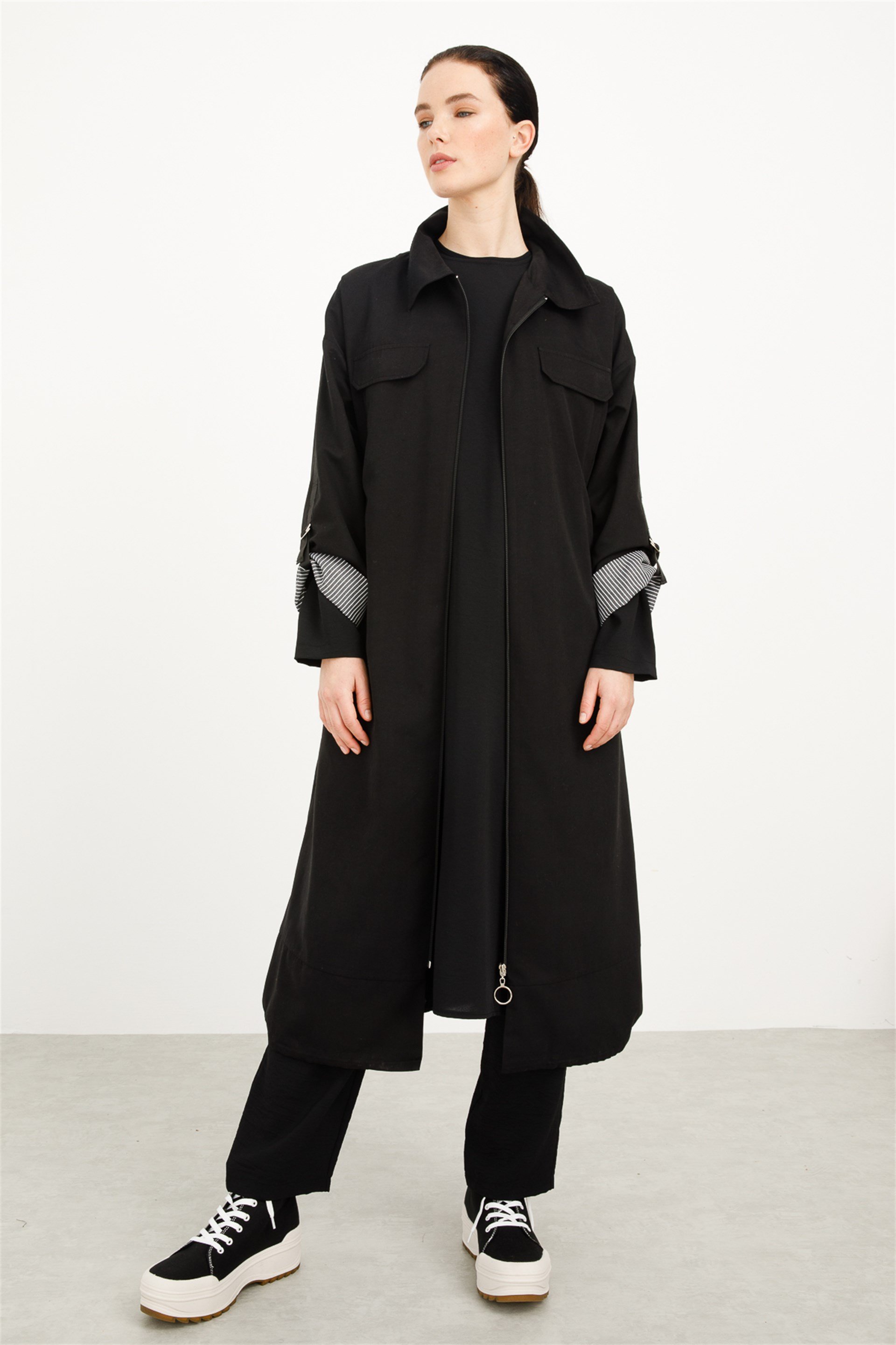 Rüzgar Geçirmez ve Su Tutmaz Fonksiyonel Hafif Pamuklu Kumaştan Spor Boy Trençkot-Siyah